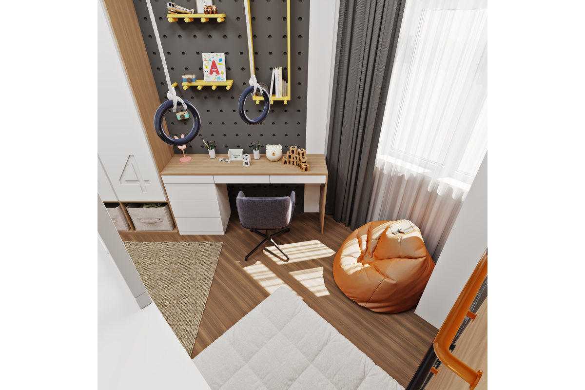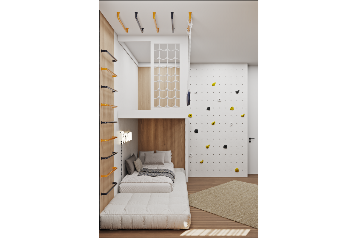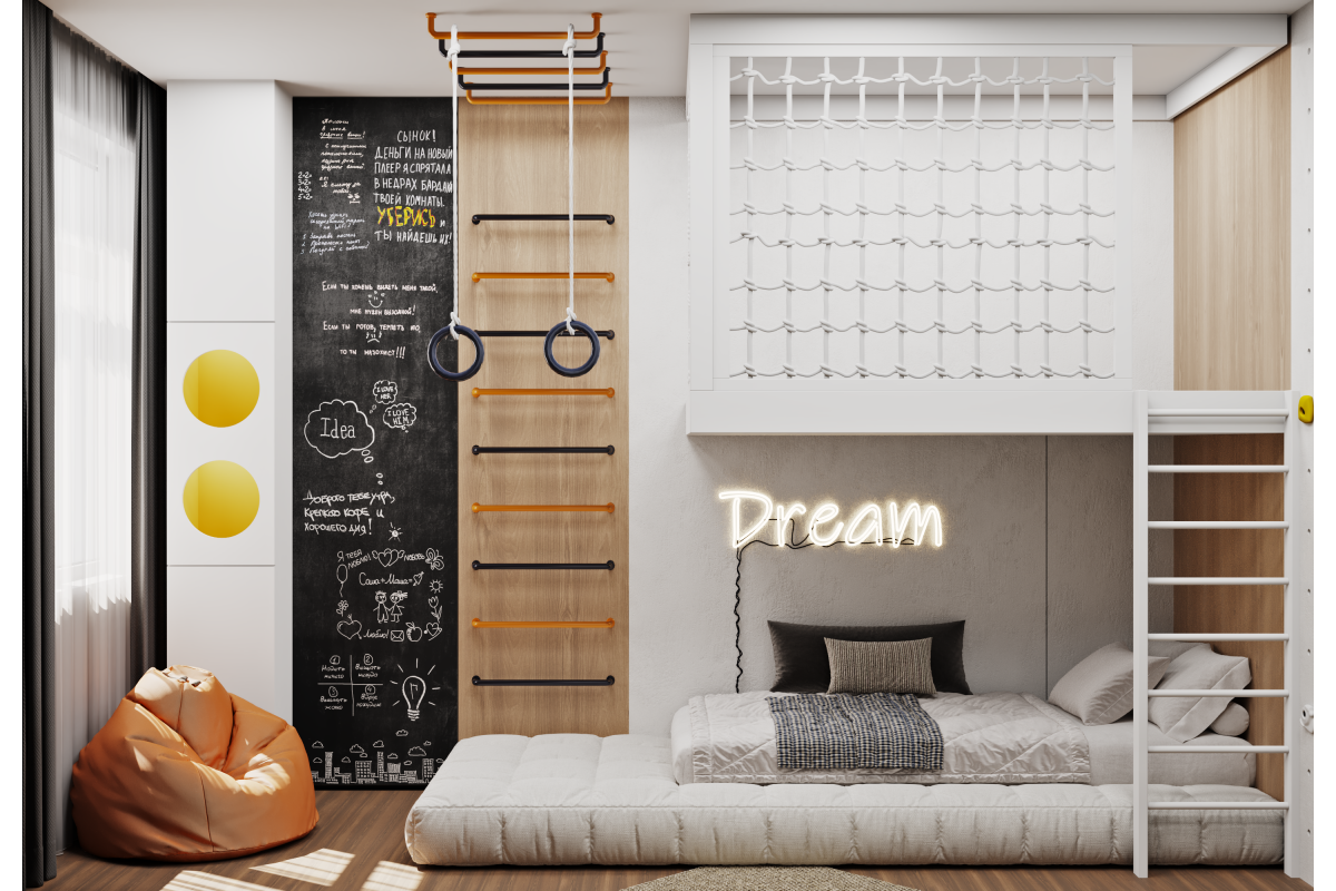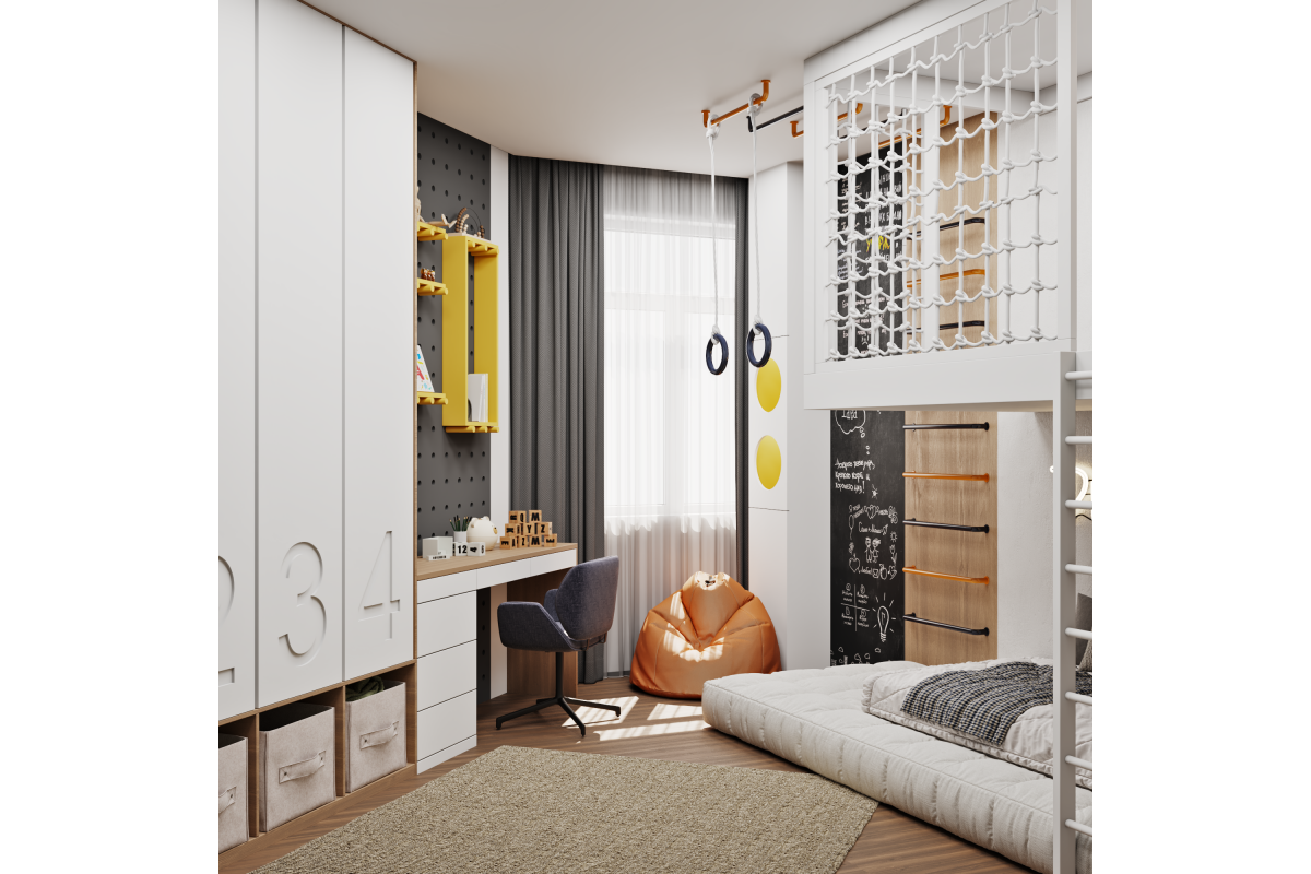 И конечно изюминка этой детской комнаты - это идеально вписанные спортивные снаряды, которые не превращают комнату в спорт зал, но при этом функциональны и помогут активности ребенка.
