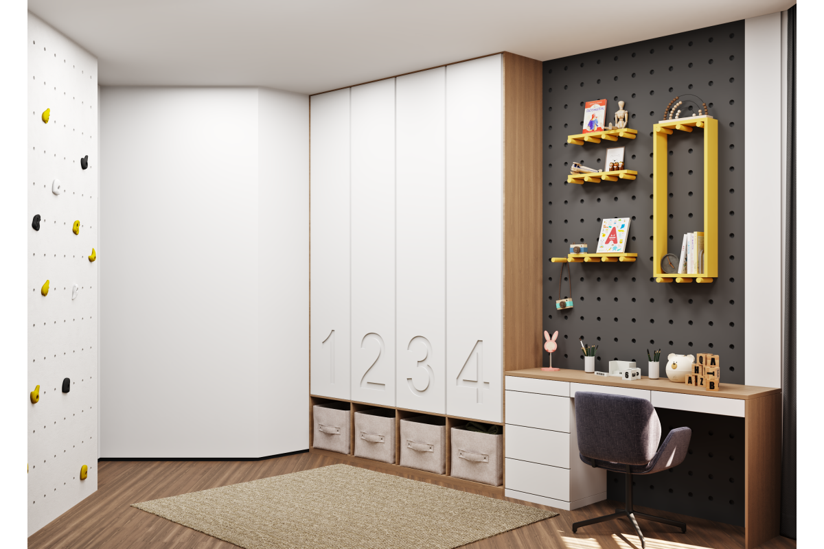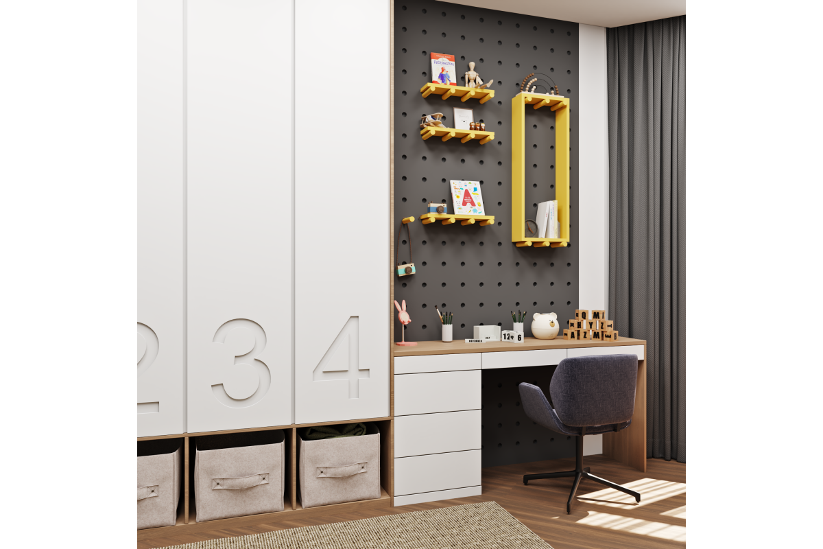 Комната сочетает в себе стильный серый, натуральное дерево, яркий желтый и конечно базовый белый. В нашей палитре 25 цветов, вы можете выбрать один тон или комбинацию нескольких оттенков, подбирая под интерьер комнаты. Возможна покраска по RAL, NCS.