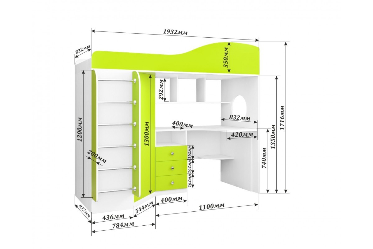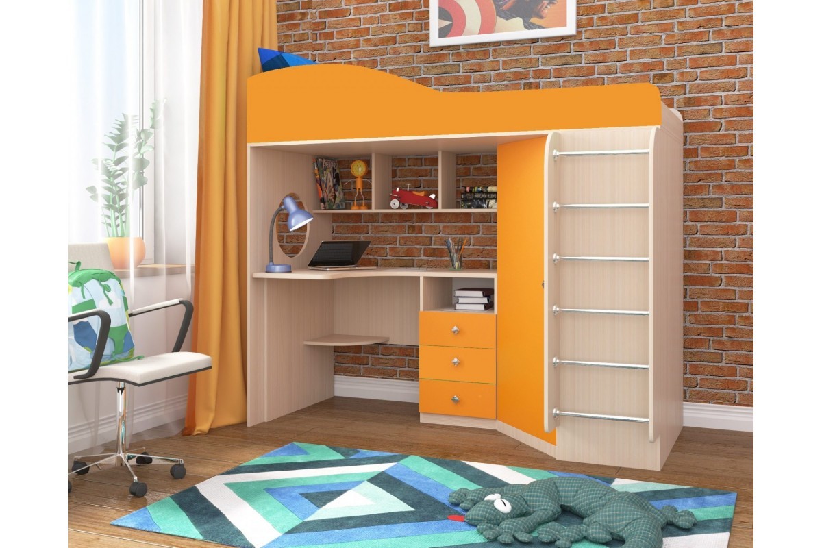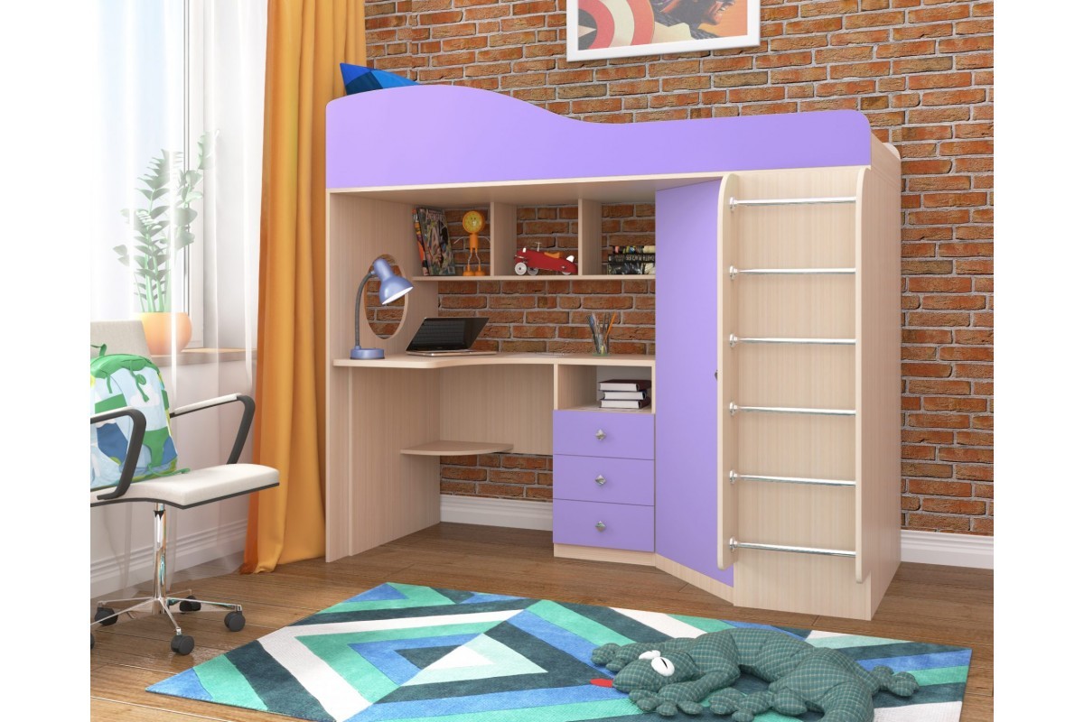 Кровать-чердак Кадет-1 с металлической лестницей — это универсальное решение для детской комнаты, так как помимо комфортного спального места в ней предусмотрено рабочее пространство с письменным столом, навесными полками над столешницей и выдвижными ящиками под столом для хранения канцелярских принадлежностей, книг и других мелочей. Для одежды предусмотрен удобный угловой встроенный шкаф.