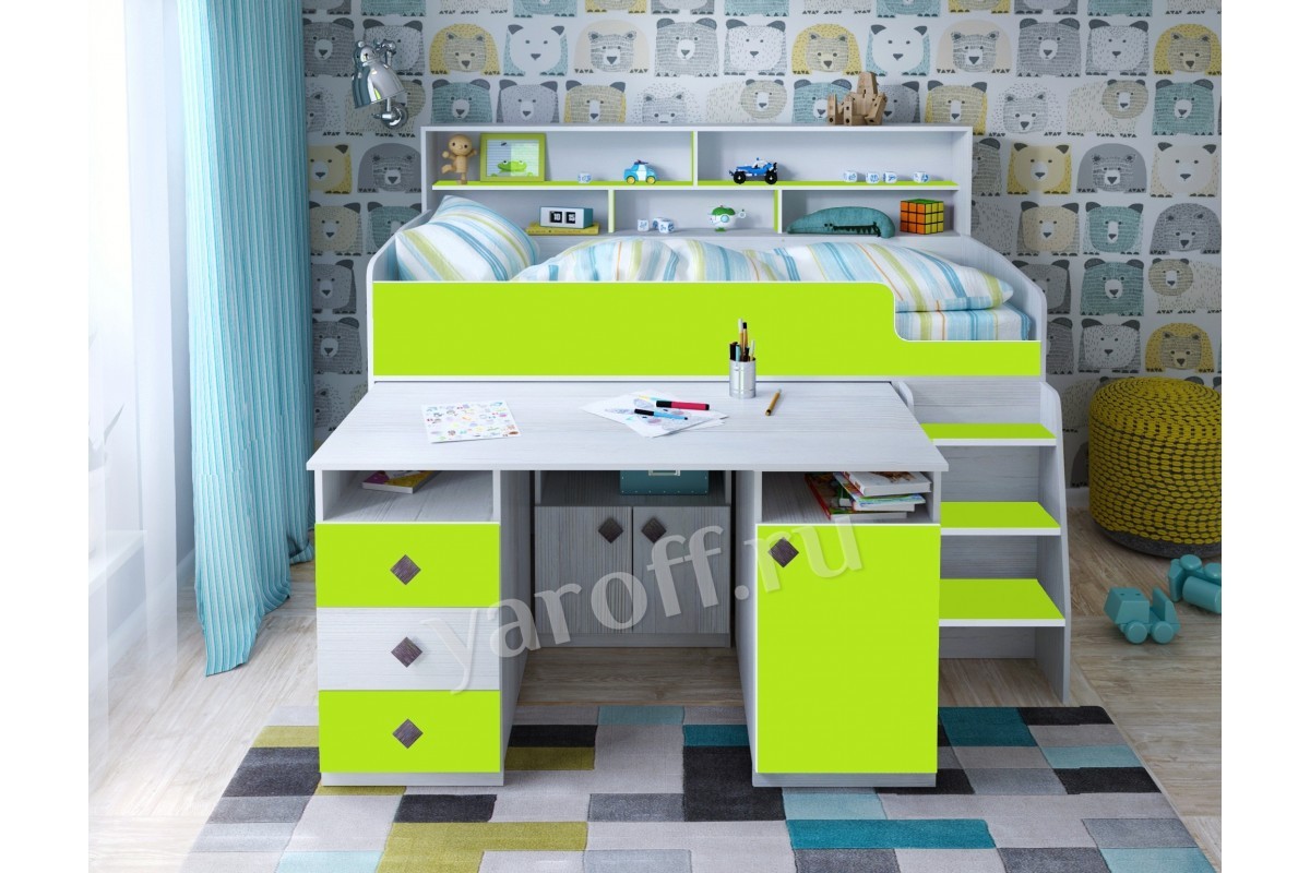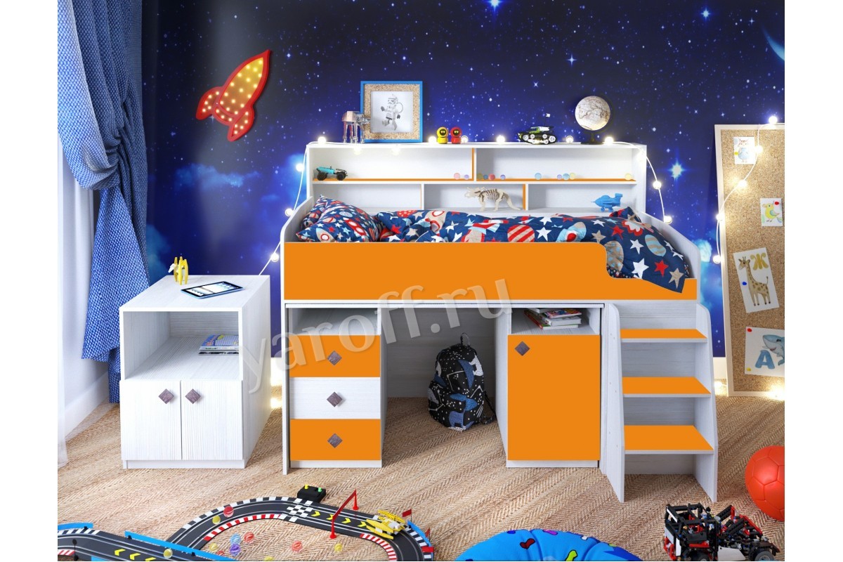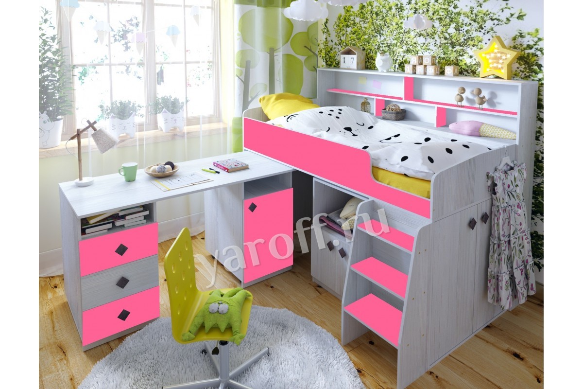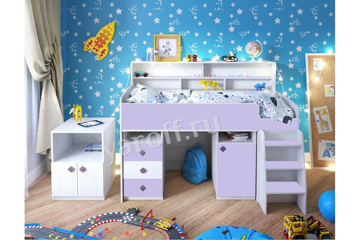 Под верхним ярусом у кровати-чердака «Малыш-5» от производителя ЯРОФФ предусмотрена тумба и небольшой шкаф, в которые поместятся не только игрушки, но также одежда. Комплекс дополнит стол с выдвижными ящиками и встроенной тумбой, выполненные в той же стилистике и цвете. Кровать-чердак «Малыш-5» станет настоящим украшением детской комнаты как для мальчика, так и для девочки.