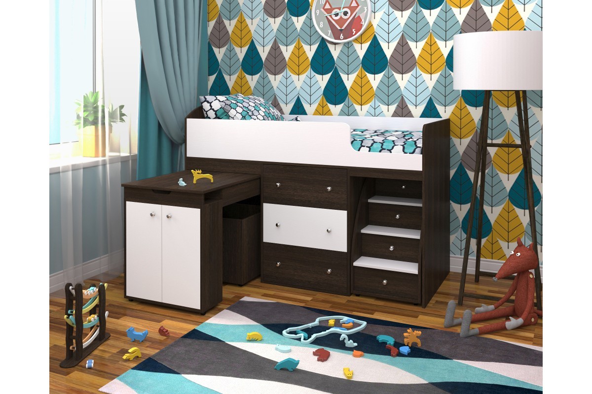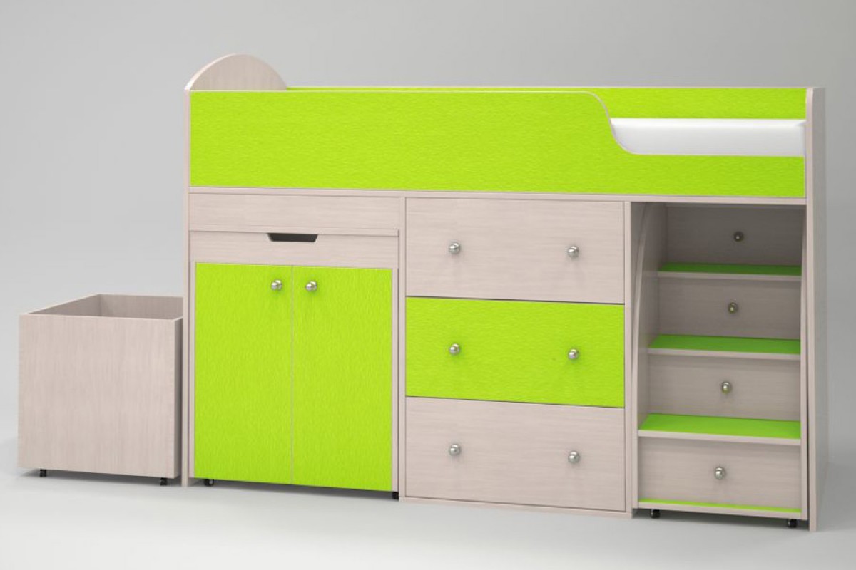 Кровать - чердак Малыш – это комплекс, включающий в себя кровать, комод, столик с ящиком для письменных принадлежностей и большую лестницу, по которой удобно подниматься ребенку.