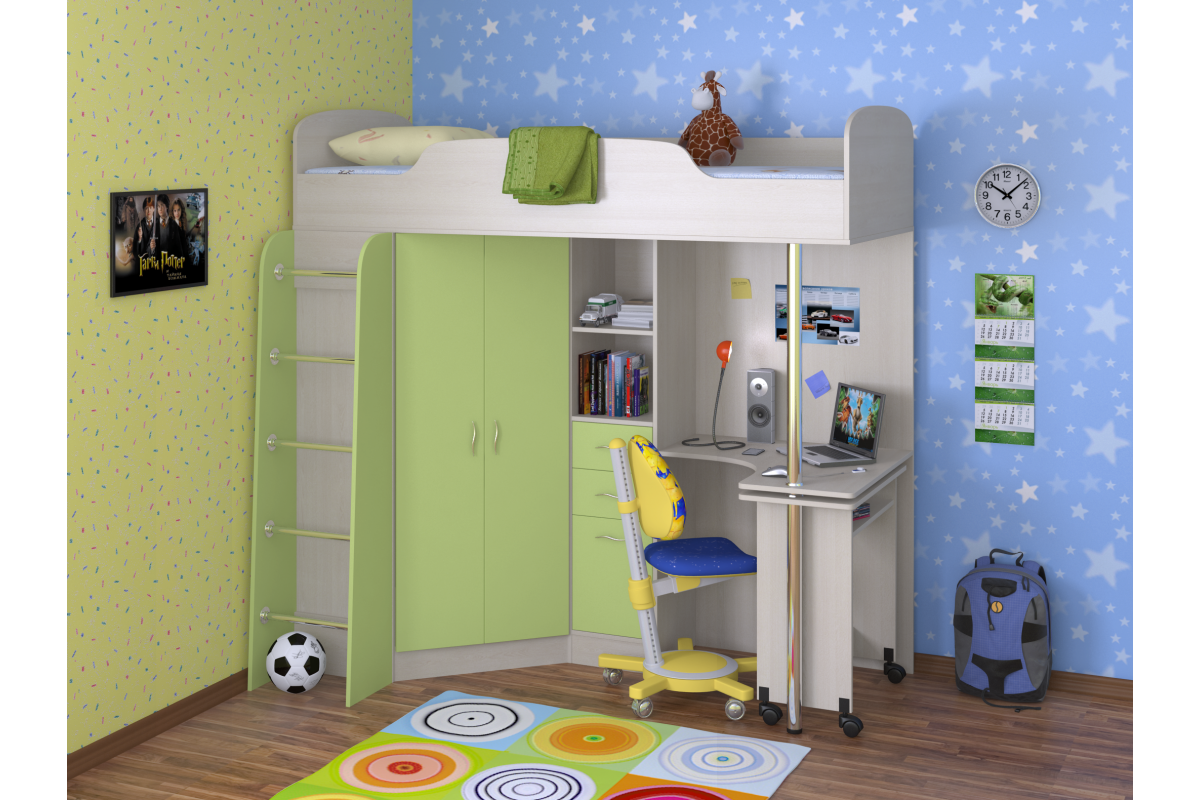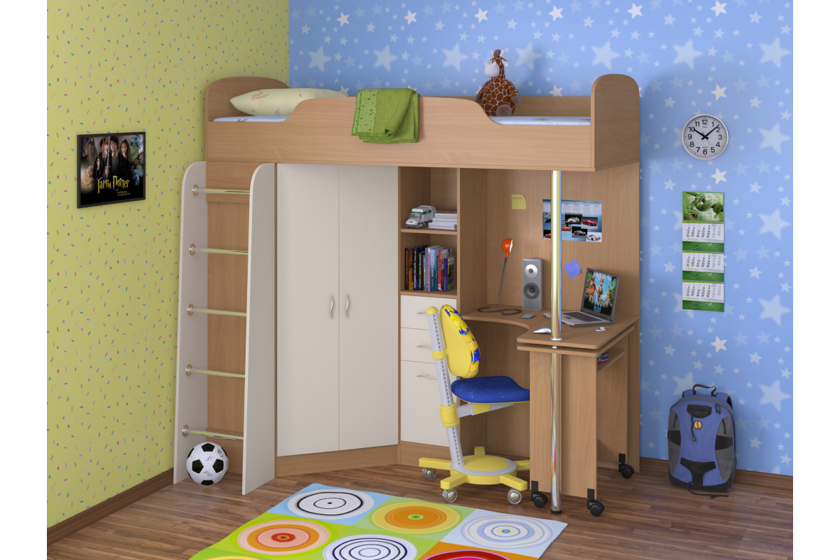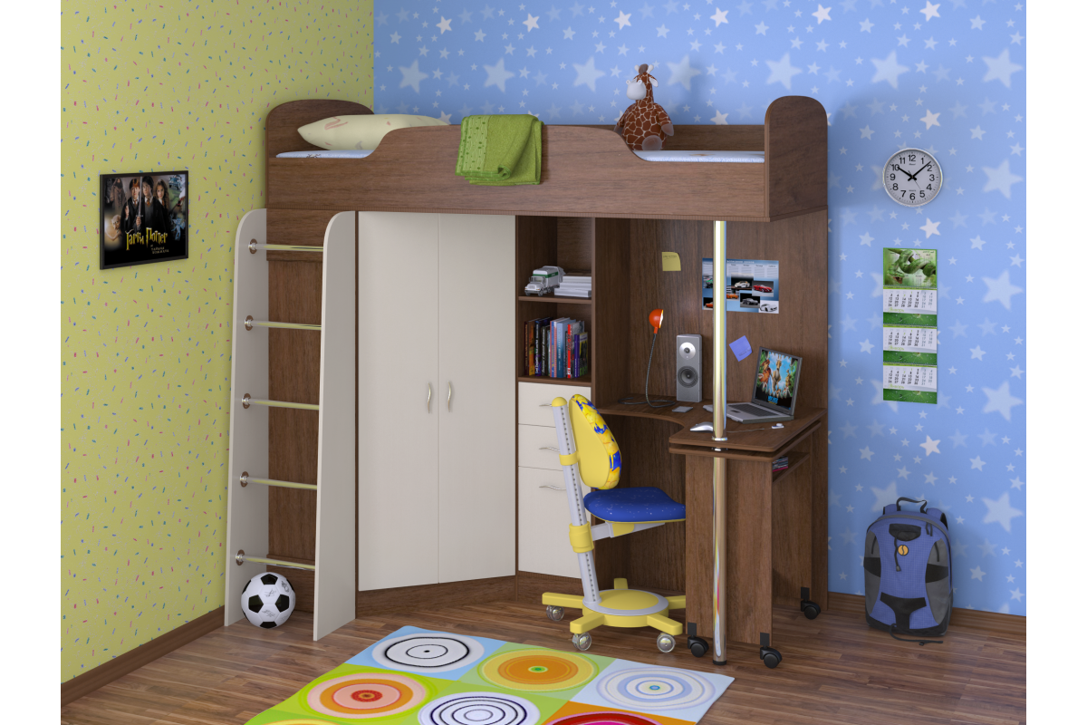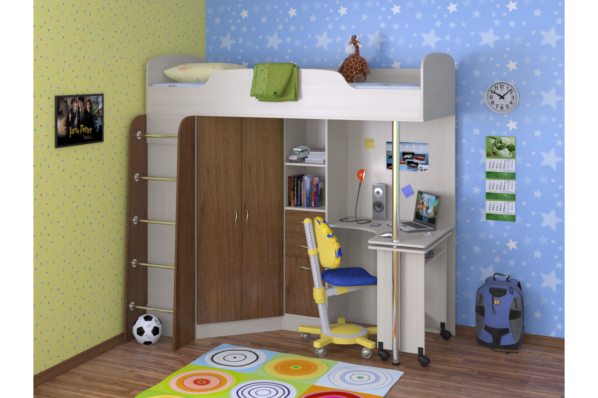 Представляет собой самодостаточный комплекс включающий в себя зону для сна, шкаф-пенал и полноценный рабочий стол. Прочная конструкция рассчитана на детей от 3 до 16 лет. Такая детская обеспечит разумную экономию пространства в вашем доме и полностью обеспечит выполнение всех многообразных функций детской и подростковой комнаты.