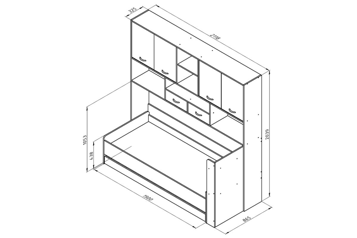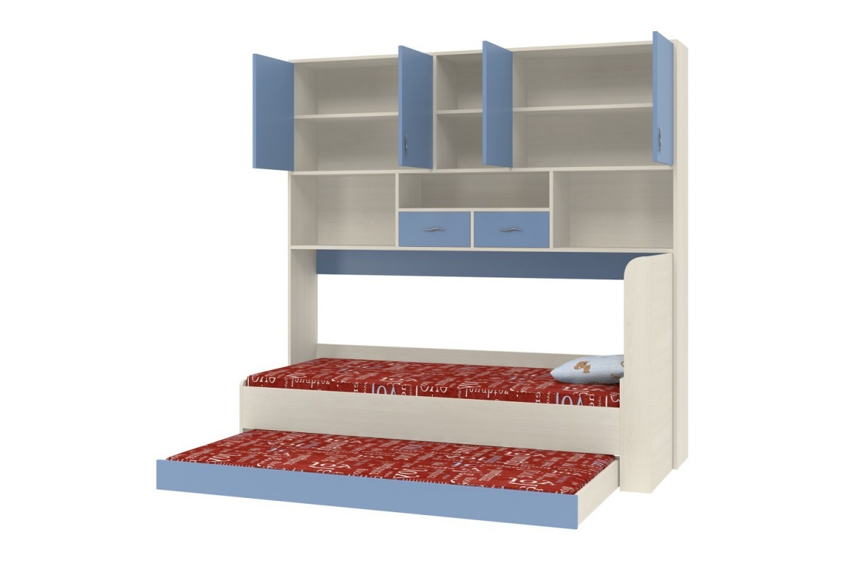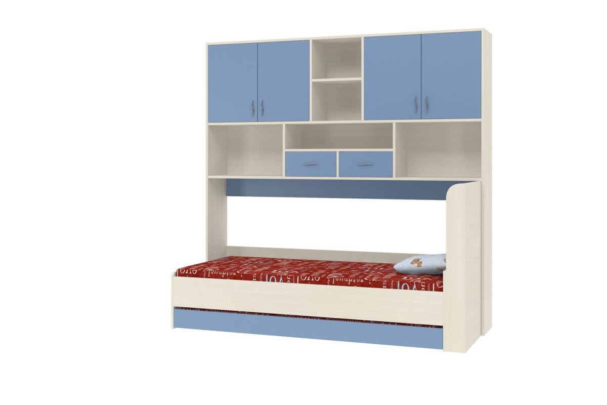 Это удобный и функциональный комплекс. Над спальным местом располагаются 5 открытых ниш, на которых удобно хранить книги и предметы декора, 2 закрытых полки внутри 2 двухдверных шкафчиков, также предназначенных для хранения книг, учебных принадлежностей и других личных вещей, а также 2 выдвижных ящика, которые могут использоваться в качестве дополнительного пространства для хранения. Снизу мобильное спальное место оснащено полками, а также выкатным ящиком, которое может быть использовано для хранения постельного белья. Спальное место можно развернуть, чтобы изголовье было справа или слева.