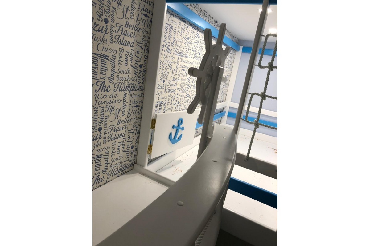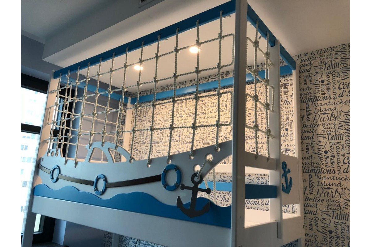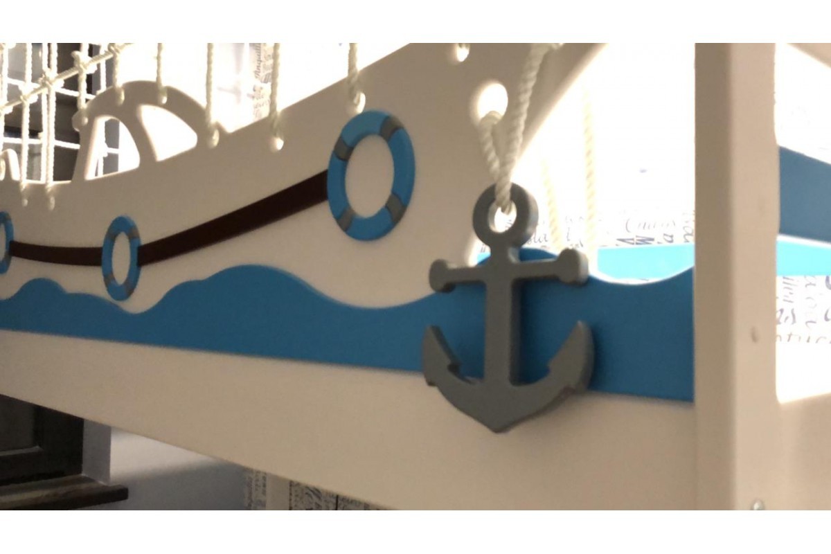 Оригинальная кровать - корабль непременно порадует вашего малыша, воплотив детские мечтания о море, приключениях и кораблях. Двухъярусная кровать в морском стиле создаст максимально близкую атмосферу к каюте корабля. На второй ярус ребенок может подниматься по деревянному, веревочному трапу или сетке. Данную модель украшают защитный декорированный фасад - бортик в виде настоящего корабля, функциональный крутящийся штурвал, якорь, а также съемный бортик, имитирующий морские волны.