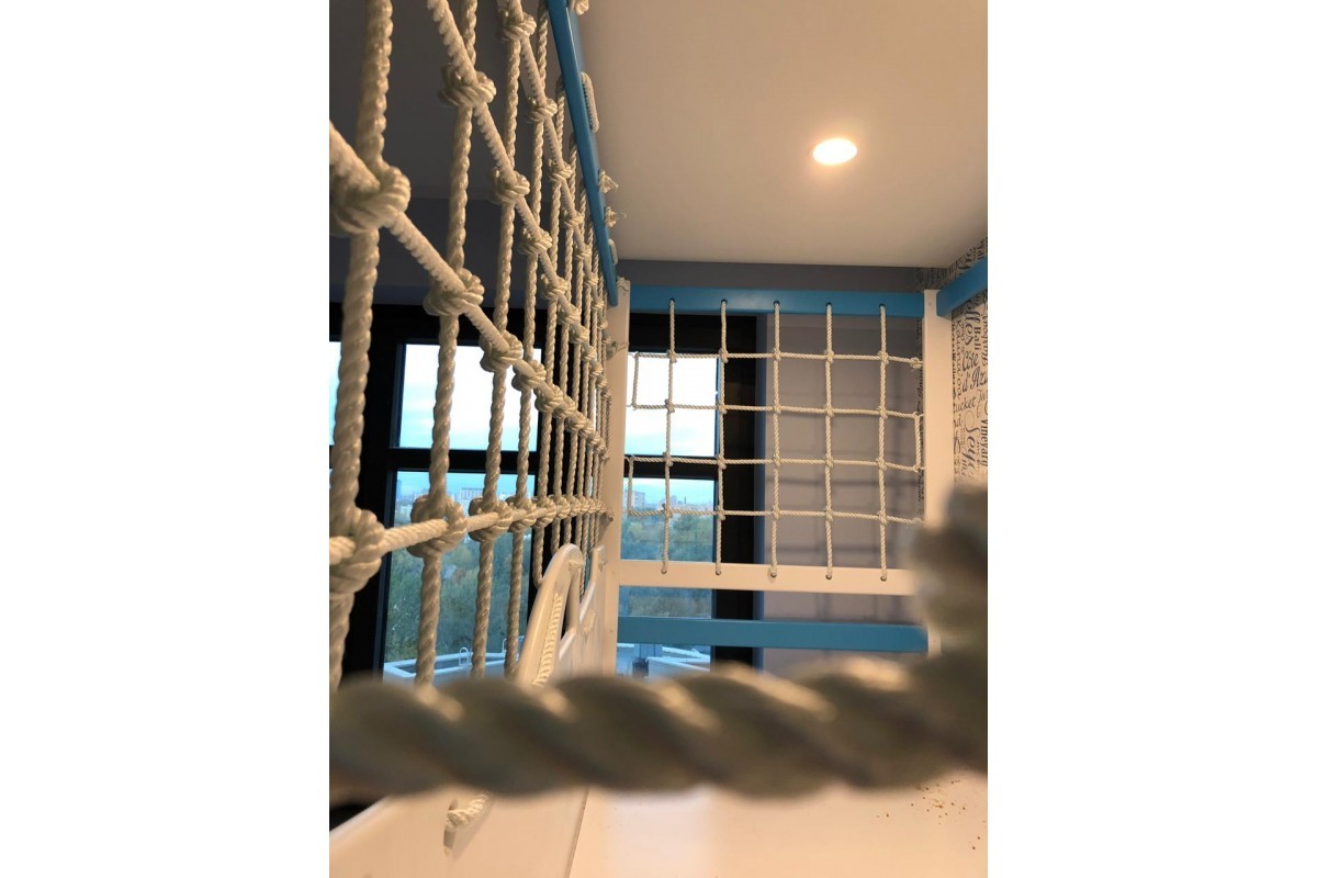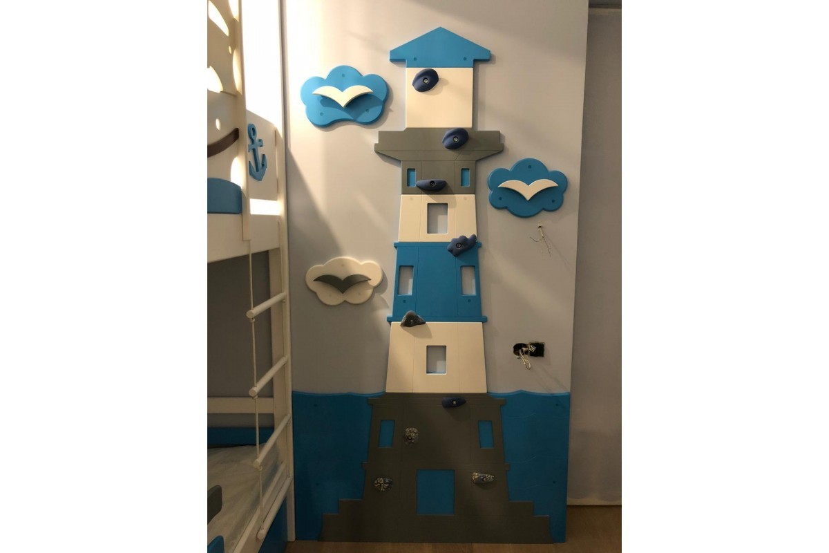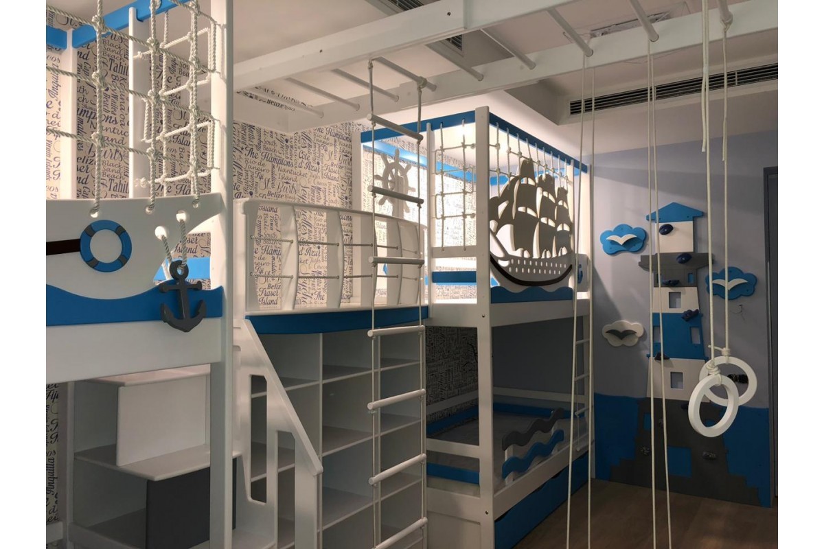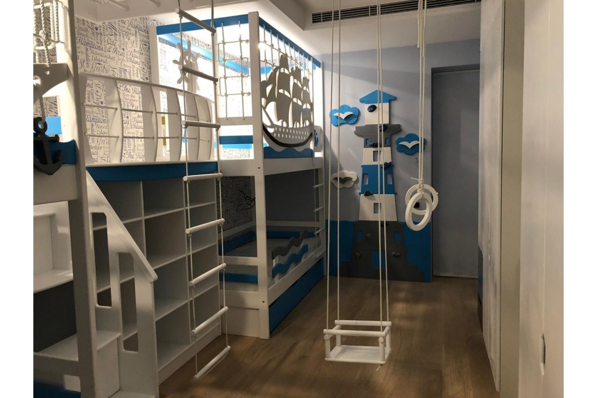 Оригинальная кровать - корабль непременно порадует вашего малыша, воплотив детские мечтания о море, приключениях и кораблях. Двухъярусная кровать в морском стиле создаст максимально близкую атмосферу к каюте корабля. На второй ярус ребенок может подниматься по деревянному, веревочному трапу или сетке. Данную модель украшают защитный декорированный фасад - бортик в виде настоящего корабля, функциональный крутящийся штурвал, якорь, а также съемный бортик, имитирующий морские волны.