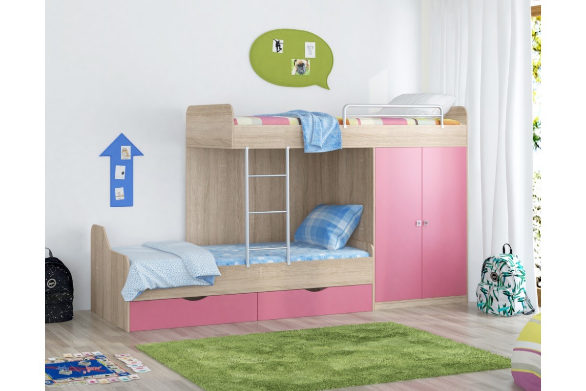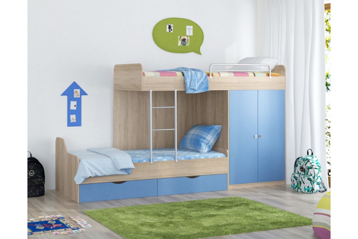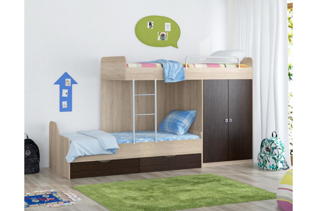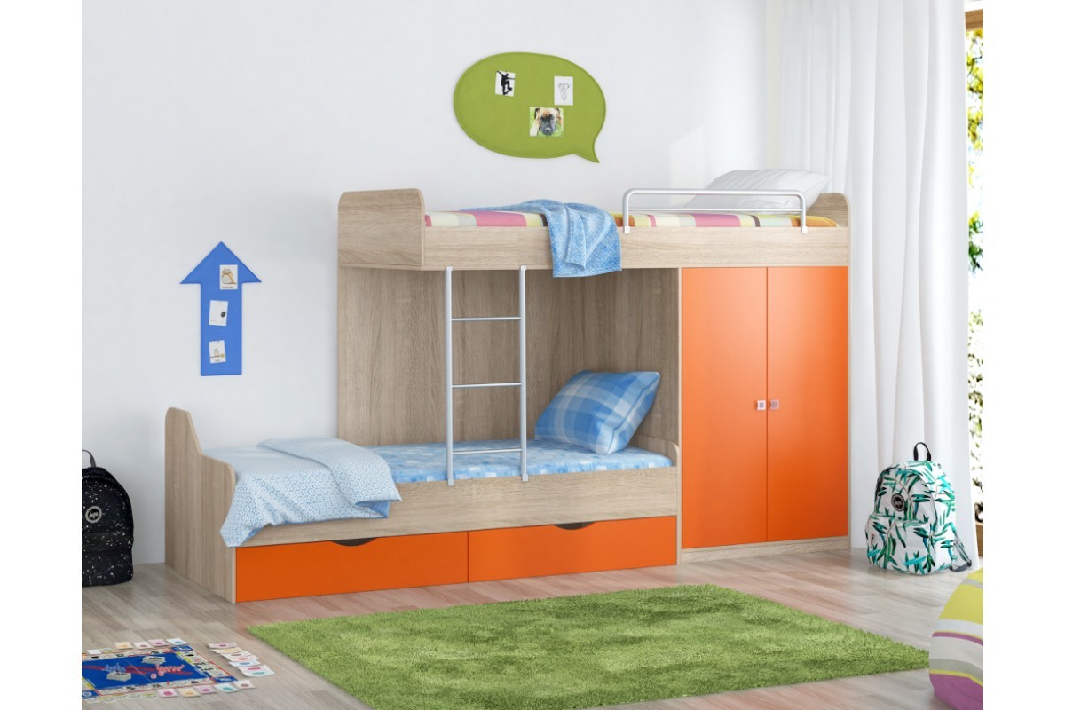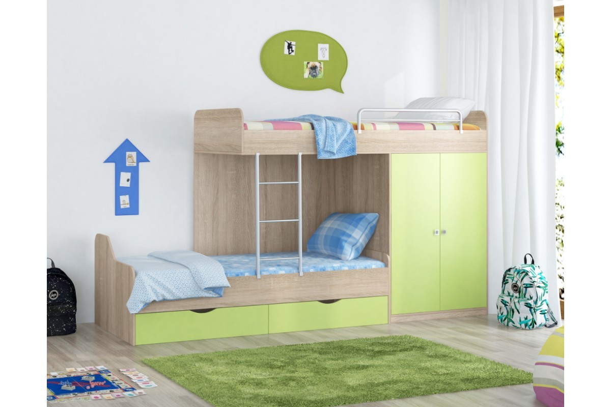 Двухъярусная Кровать Дельта - 18.02.04 - это эргономичное, оригинальное спальное место, позволяющее значительным образом сэкономить место в детской комнате. Верхний ярус оборудован прочным ограждением для защиты от падений во время сна. Непосредственно под спальным местом есть вместительный шкаф, полки и ящики. Под второй, нижней кроватью, так же расположены два выдвижных ящика.