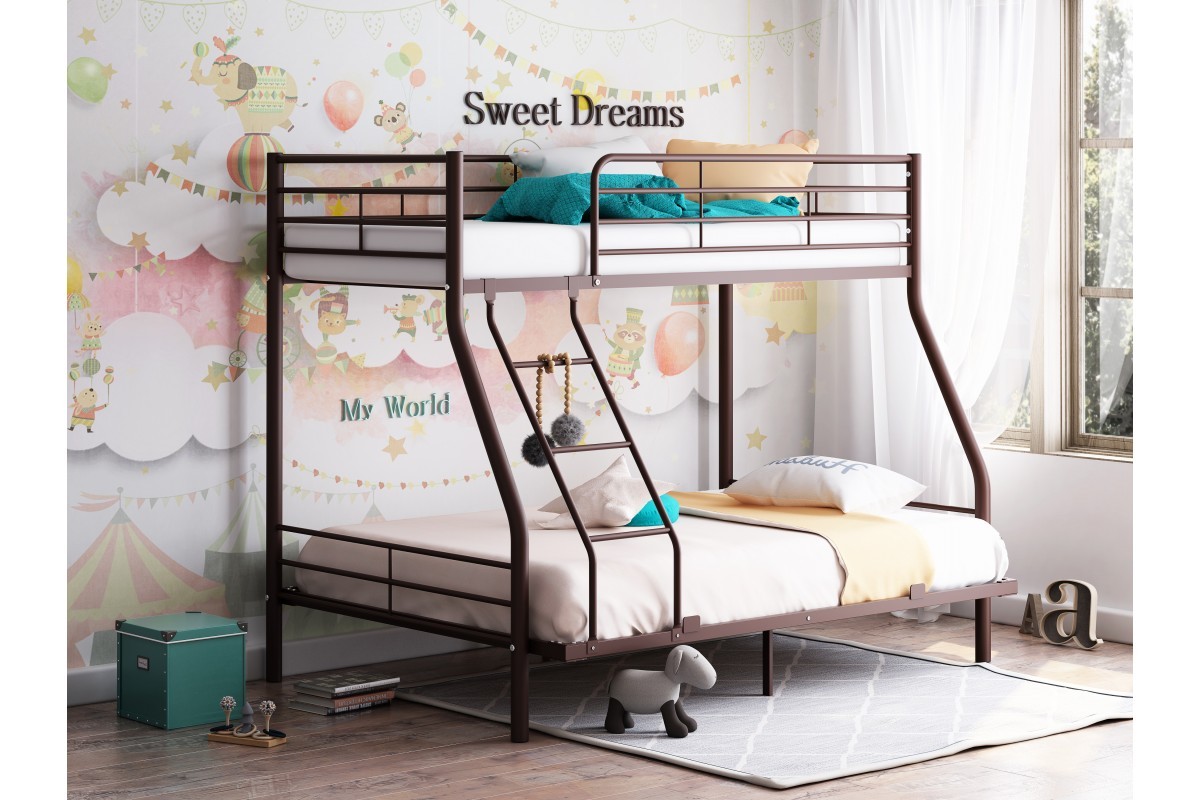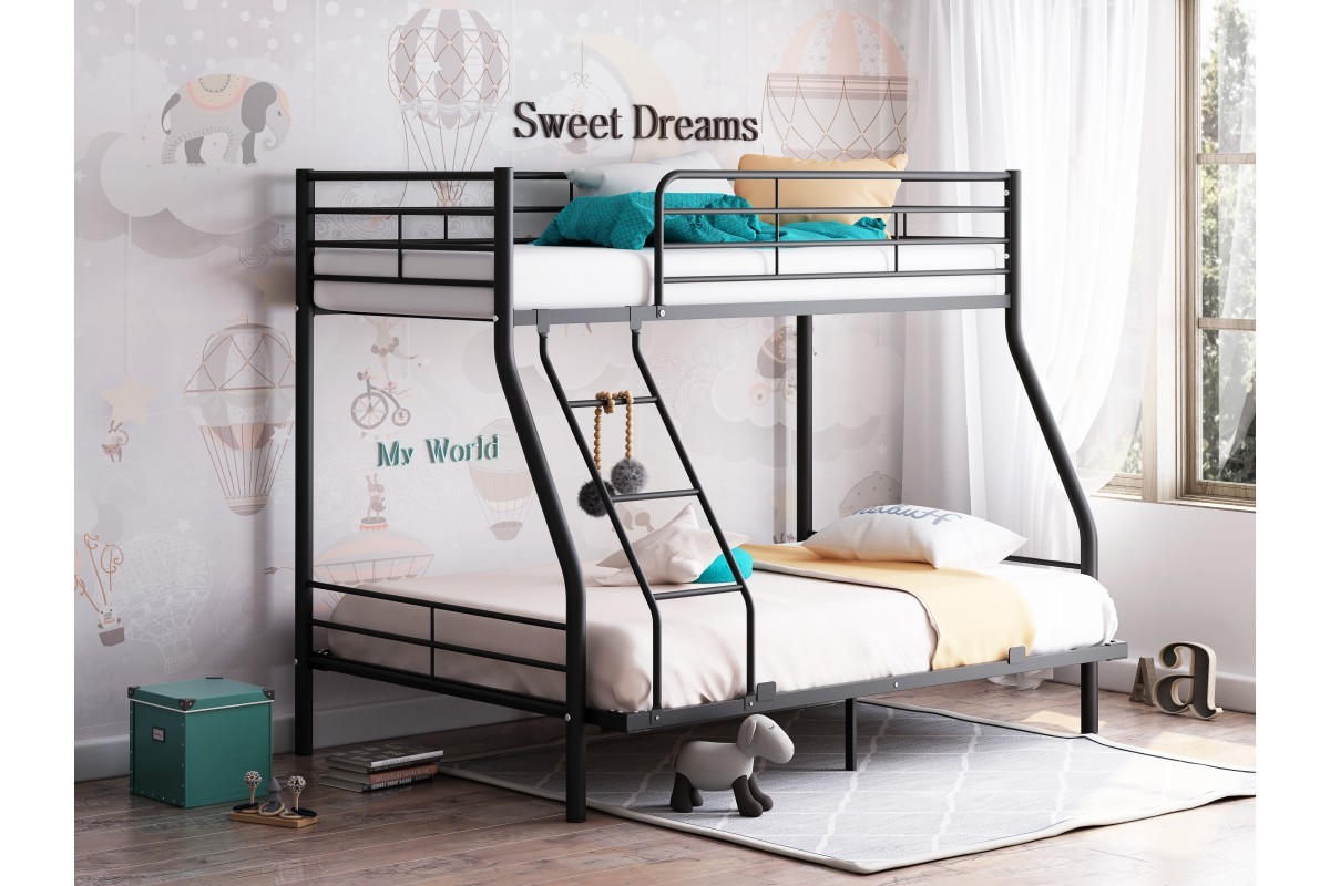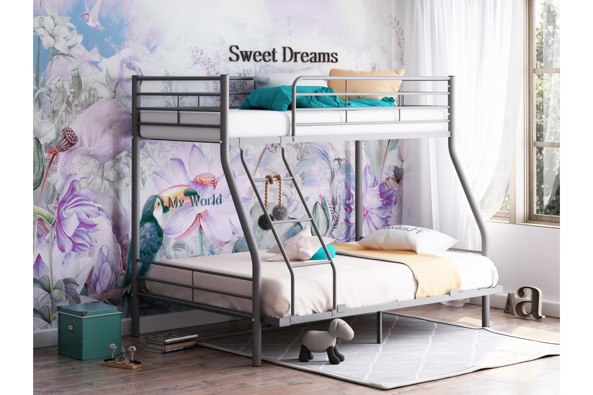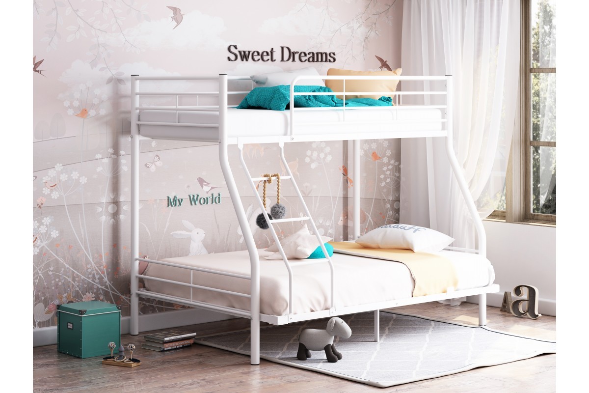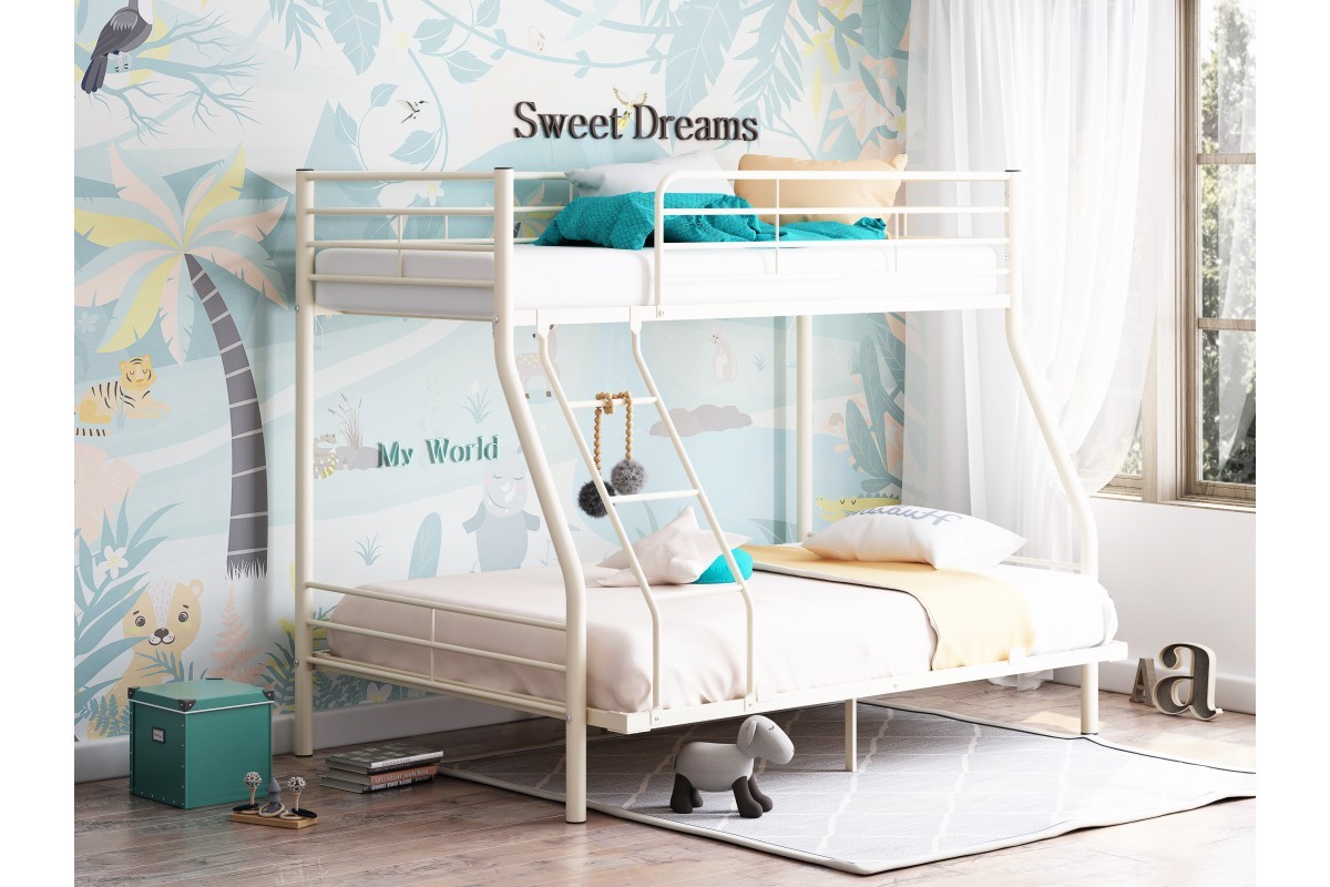 Металлическая двухъярусная кровать Гранада - 2 140 от производителя "Формула мебели" способна выдерживать нагрузку до 180 кг (на одно спальное место), что делает ее подходящей как для детей, так и для взрослых. Конструкция кровати предусматривает спальные места разных размеров. В отличие от кроватей из ЛДСП выглядит менее громоздкой. В комплект входит прочная лестница.