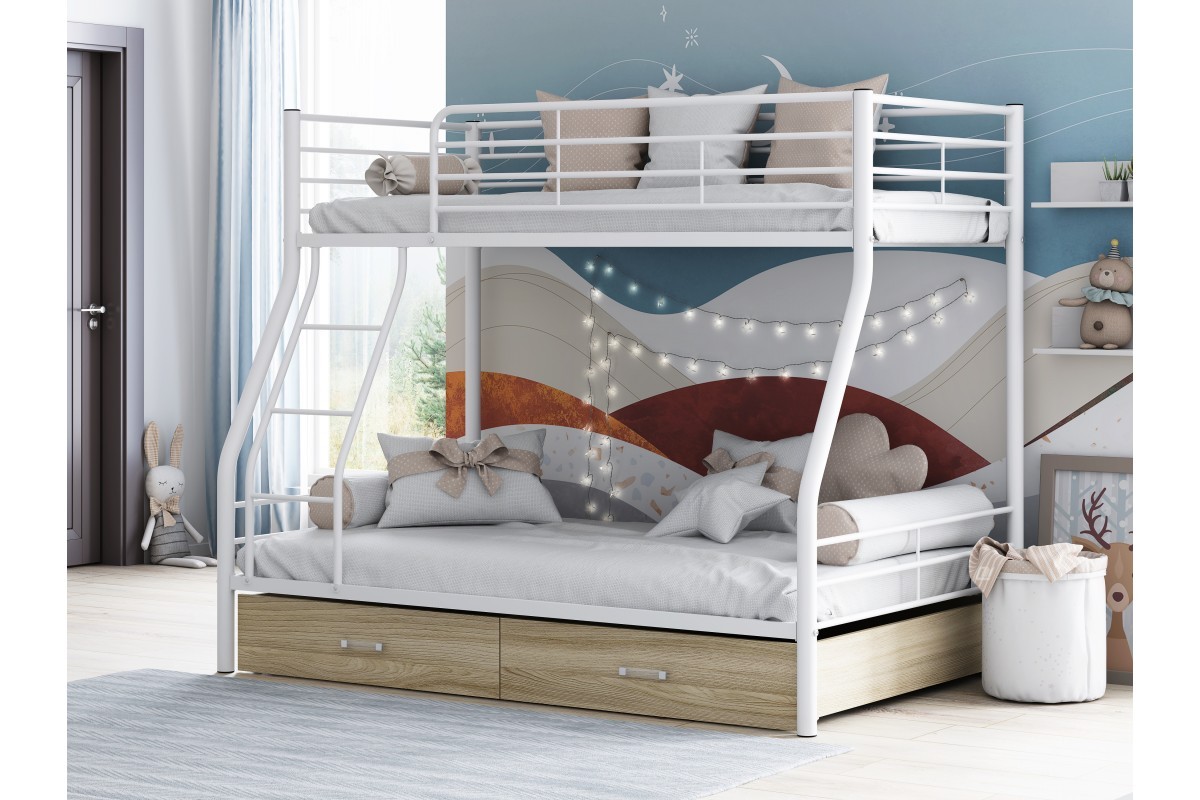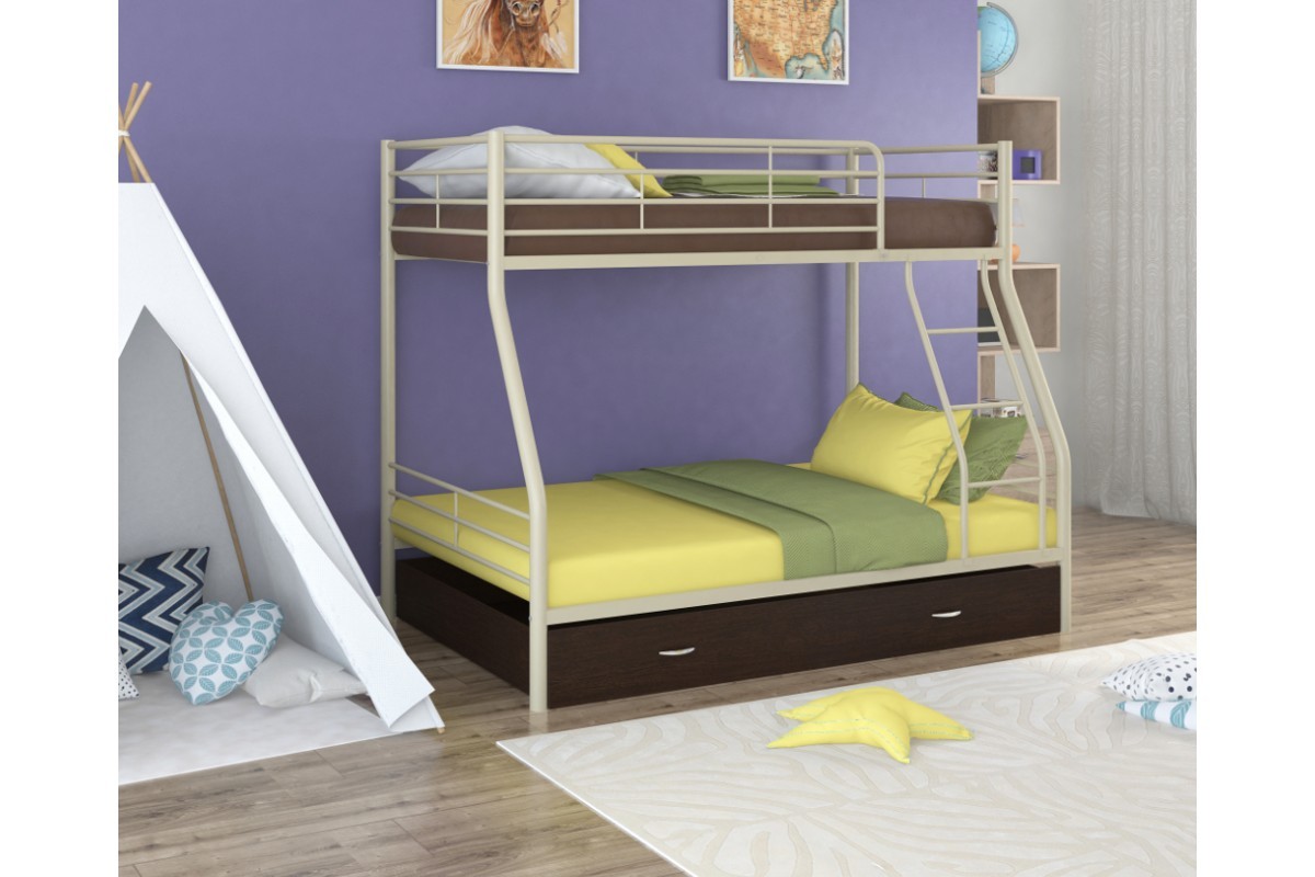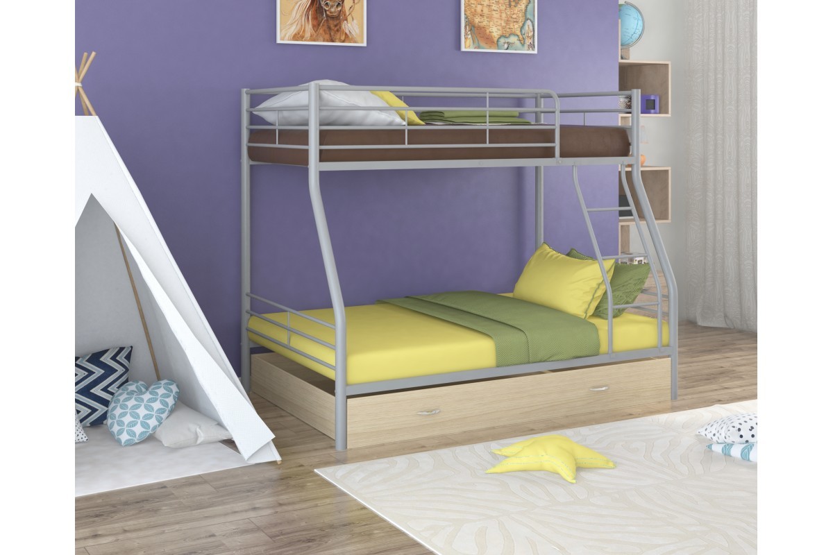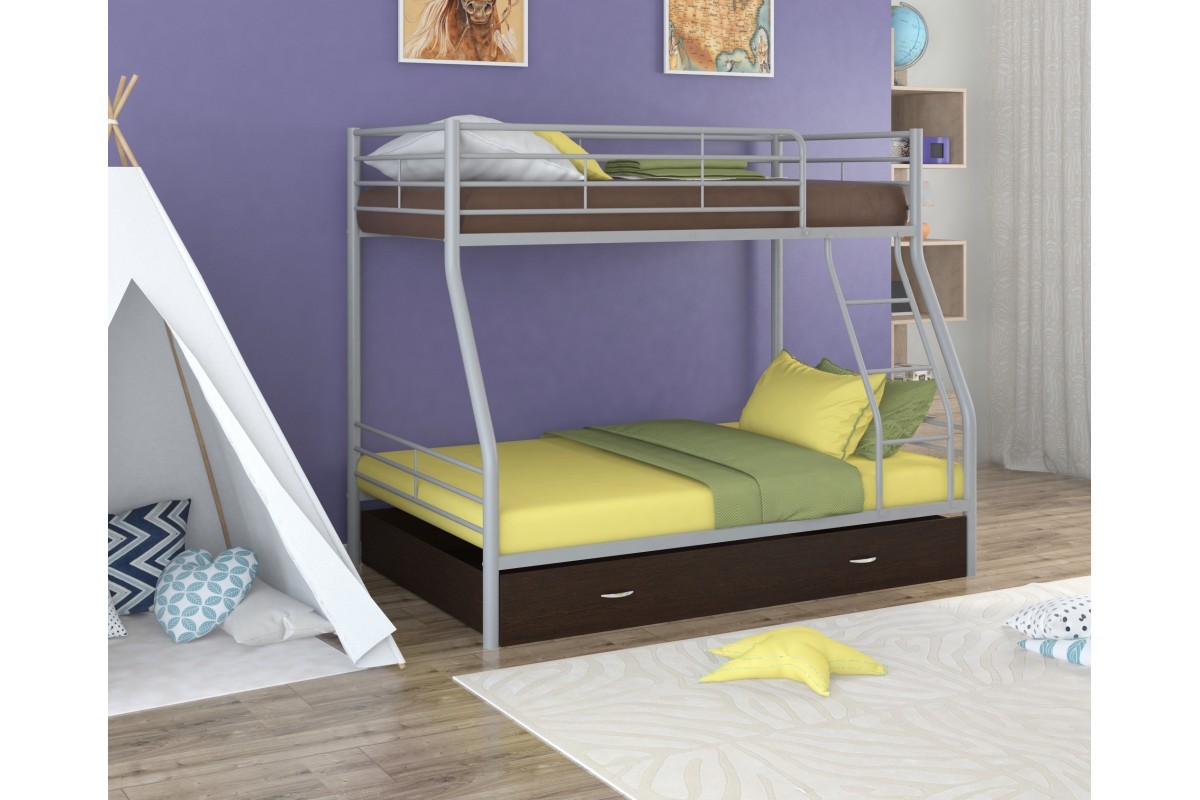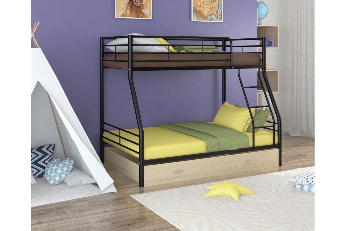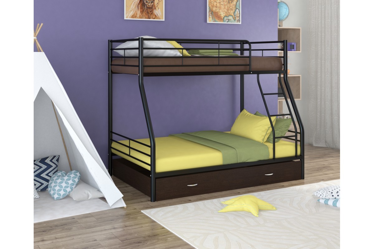 Металлическая двухъярусная кровать Гранада - 2 Я с ящиками от производителя "Формула мебели" способна выдерживать нагрузку до 180 кг (на одно спальное место), что делает ее подходящей как для детей, так и для взрослых. Конструкция кровати предусматривает спальные места разных размеров. В отличие от кроватей из ЛДСП выглядит менее громоздкой. В комплект входит прочная лестница.