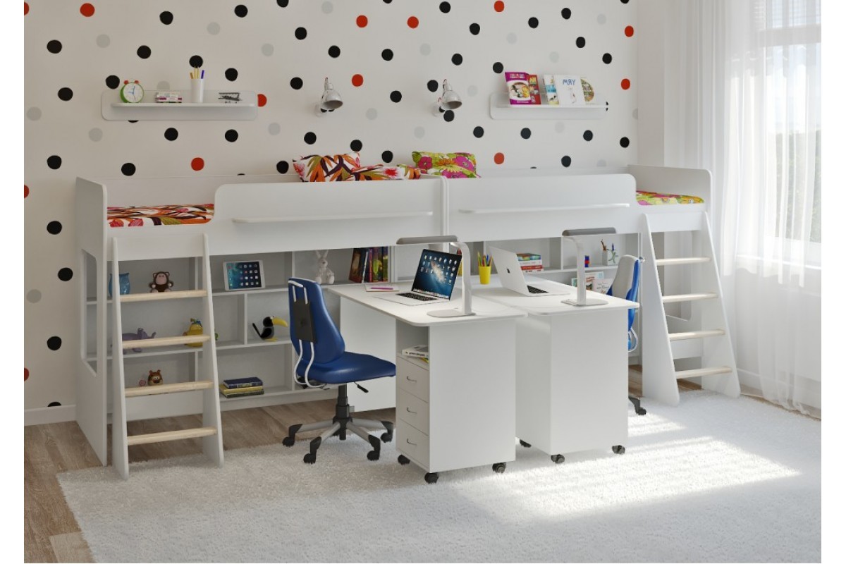 В комплект входят два письменных стола Л-03, оборудованных поворотными колесами. Столы легко перемещаются по полу, задвигаются и выдвигаются. Три выкатных ящика стола обеспечат удобное хранение канцелярии, письменных, учебных и прочих принадлежностей. Над ящиками открытая полка для мелочей, которые будут всегда под рукой.