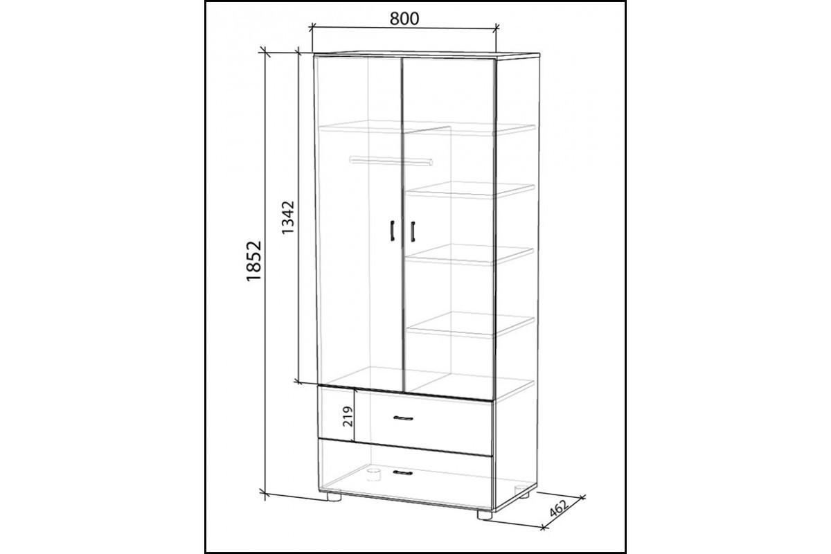 Элегантный в своей простоте шкаф, в котором всё есть - и нет ничего лишнего. Шкаф является двустворчатым, внутри две зоны:с пятью полками и со штангой для «плечиков». Над штангой также располагается полка для головных уборов. Внизу шкаф оборудован двумя выкатными ящиками. В качестве опоры служат четыре ножки, снижающие вред для полового покрытия при перестановке.