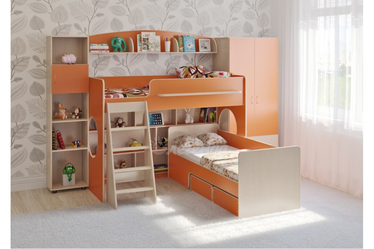 Маленькая полочка на верхнем бортике удобна для мелочей. Под спальным местом располагается игровая зона – свой уголок для ребенка. В игровой зоне располагается стеллаж,отлично подходящий для хранения игрушек. Стеллаж состоит из трех уровней, верхний и нижний уровни разделены на 3 секции, а средний – на 2. Итого 8 секций – удобно для поддержания порядка и сортировки предметов.