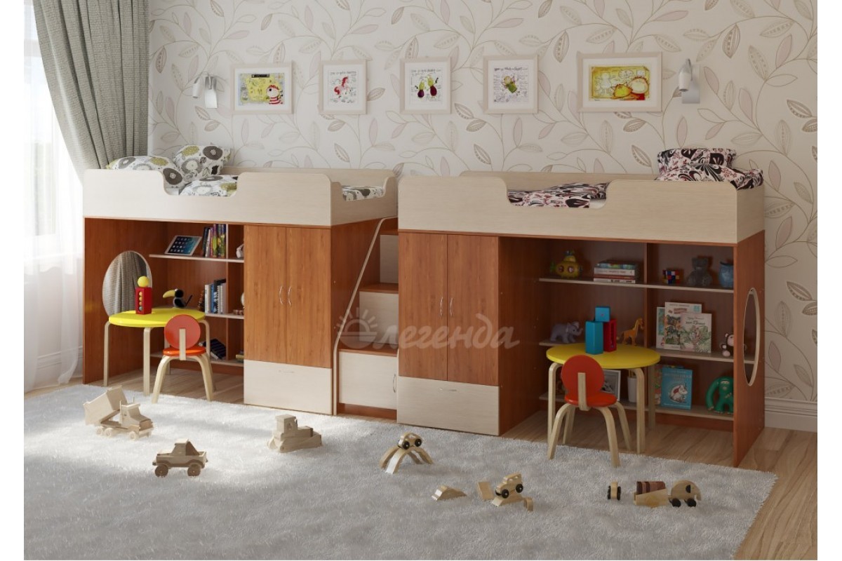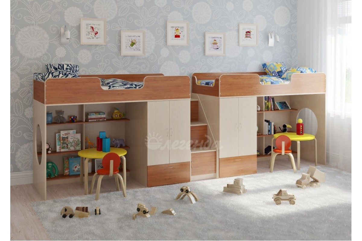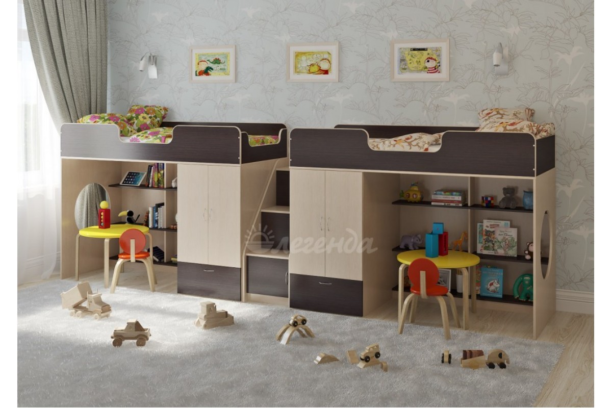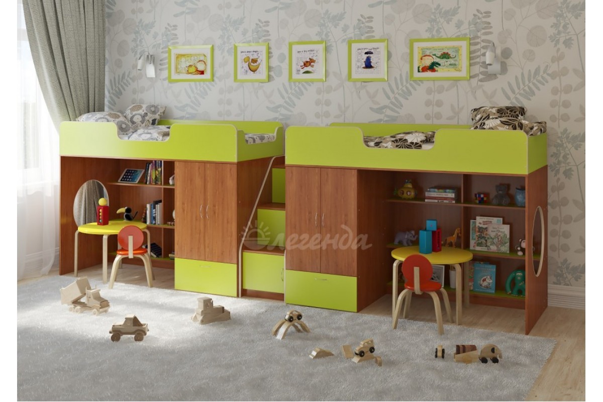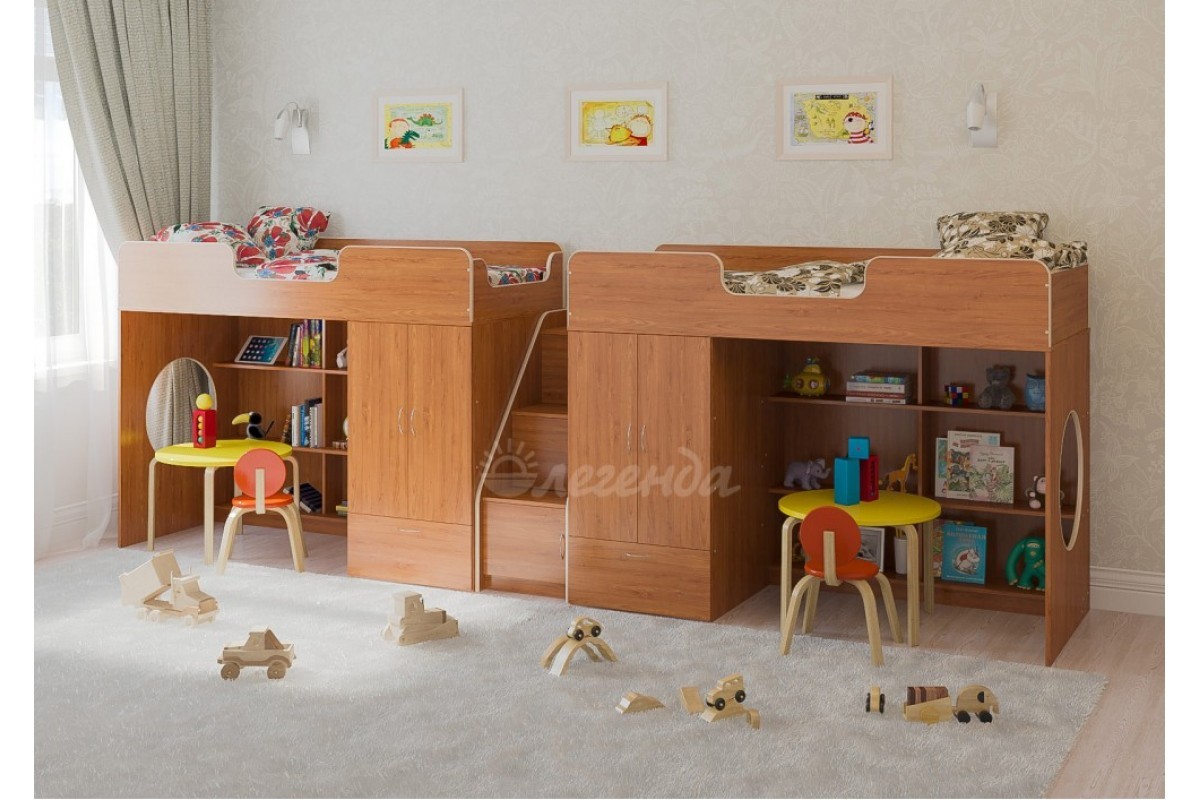 Две кровати, два шкафа, две игровых зоны – одна лестница. Идеальный вариант для сиблингов!