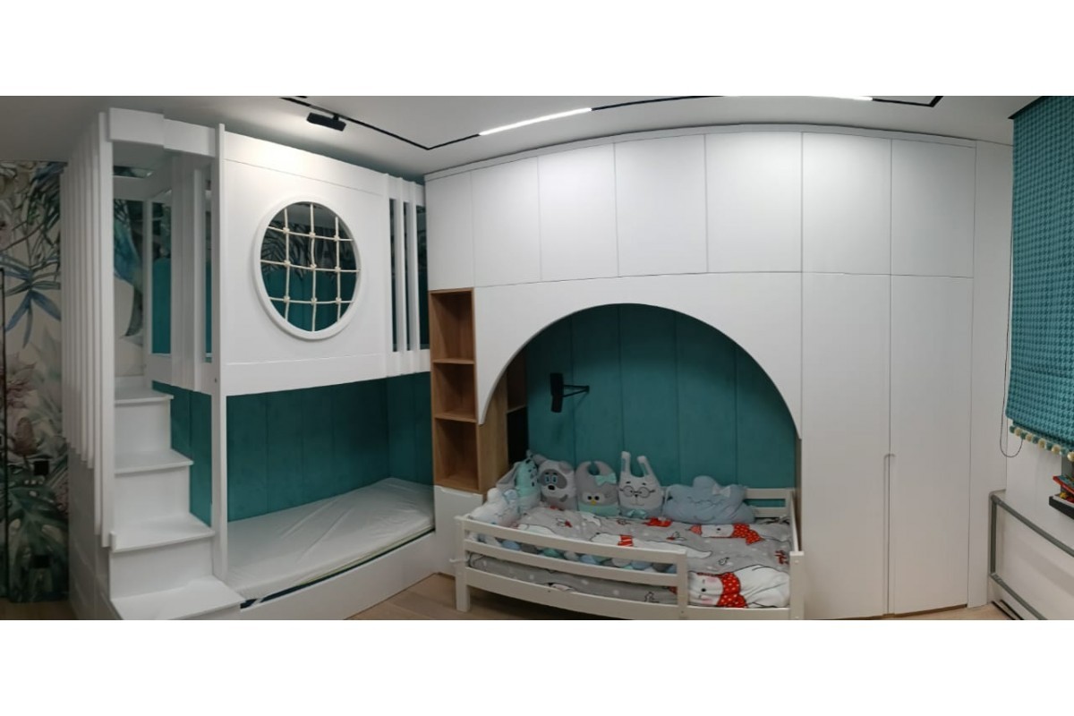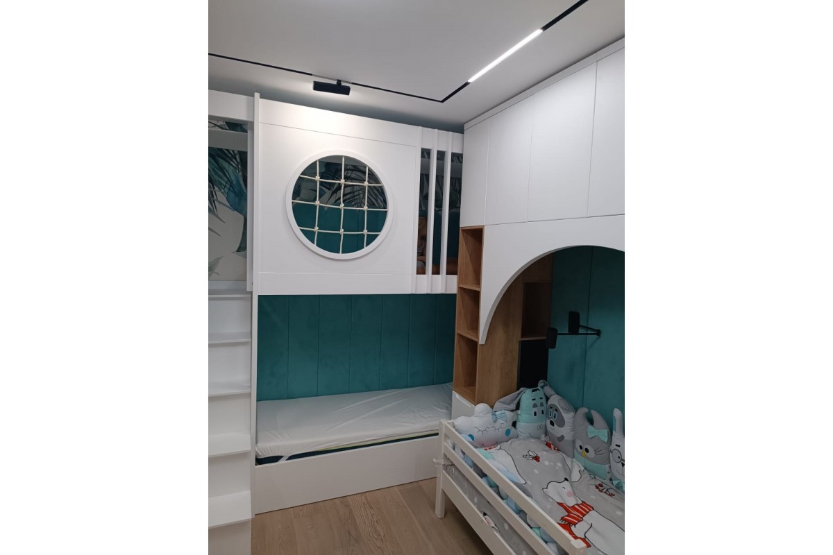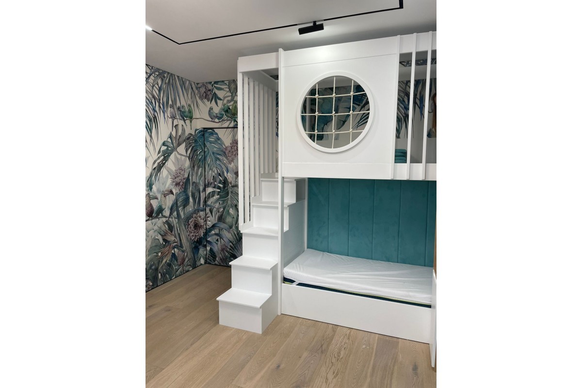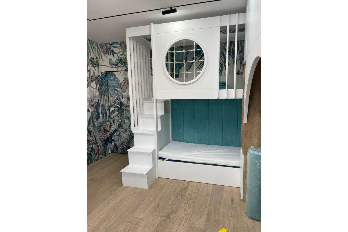 Кровать оснащена подъемным механизмом, коробом для хранения и мягкими декоративными панелями для уюта. Оригинальный второй этаж с необычным оформлением может быть не только спальной зоной. Но и игровой. А за счет высокого бортика - максимально безопасной игровой зоной. Второй ярус кровати укомплектован матом для комфортных детских игр.