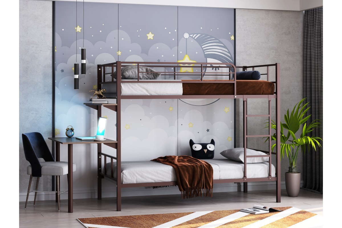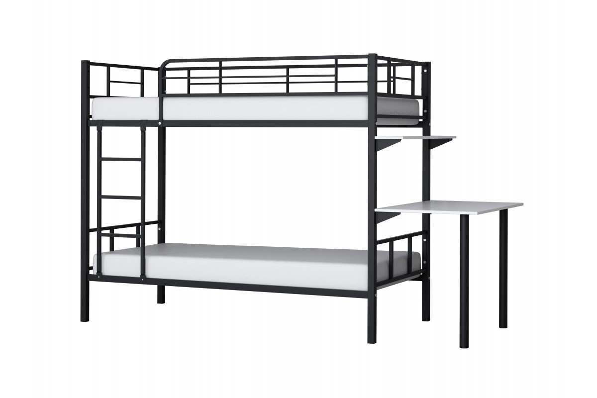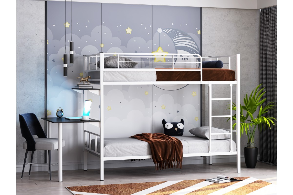 Металлическая двухъярусная кровать Севилья - 2.02 комбо от производителя "Формула мебели" способна выдерживать нагрузку до 180 кг (на одно спальное место), что делает ее подходящей как для детей, так и для взрослых. В отличие от кроватей из ЛДСП выглядит менее громоздкой. В комплект входит прочная лестница, которую по Вашему желанию можно установить справа или слева. Также кровать дополнена столом и полкой, что превращает ее в полноценный спальный комплекс.