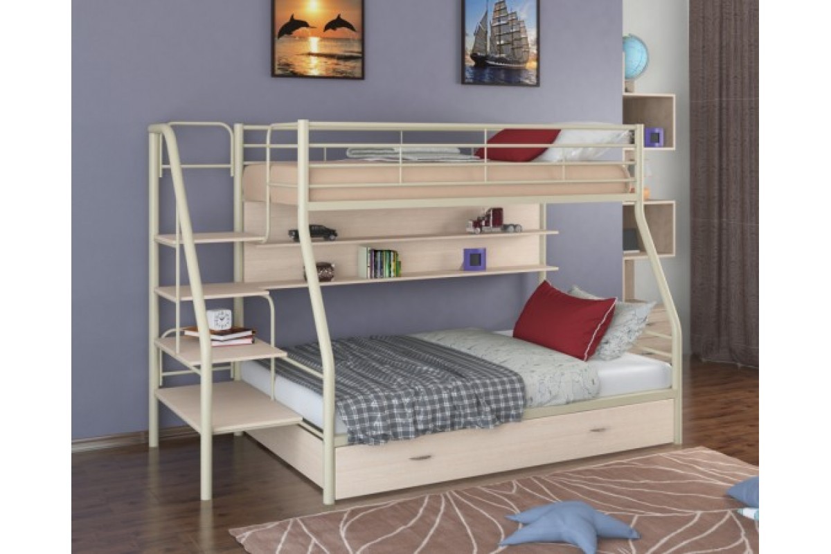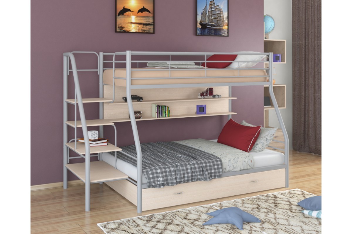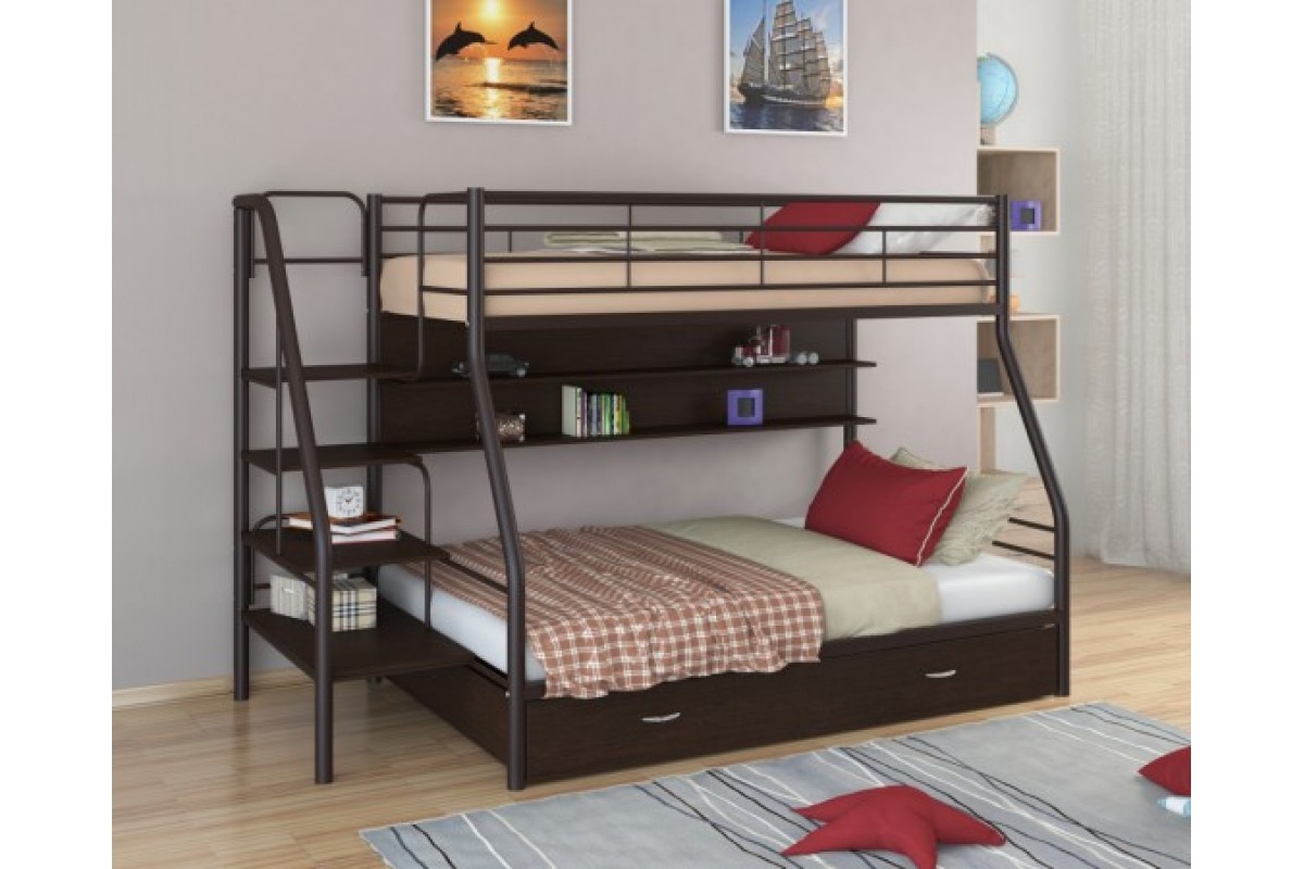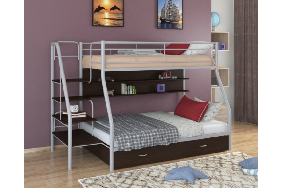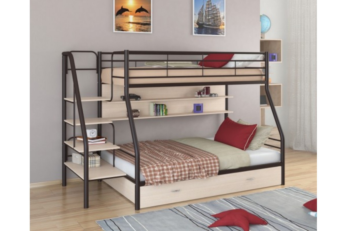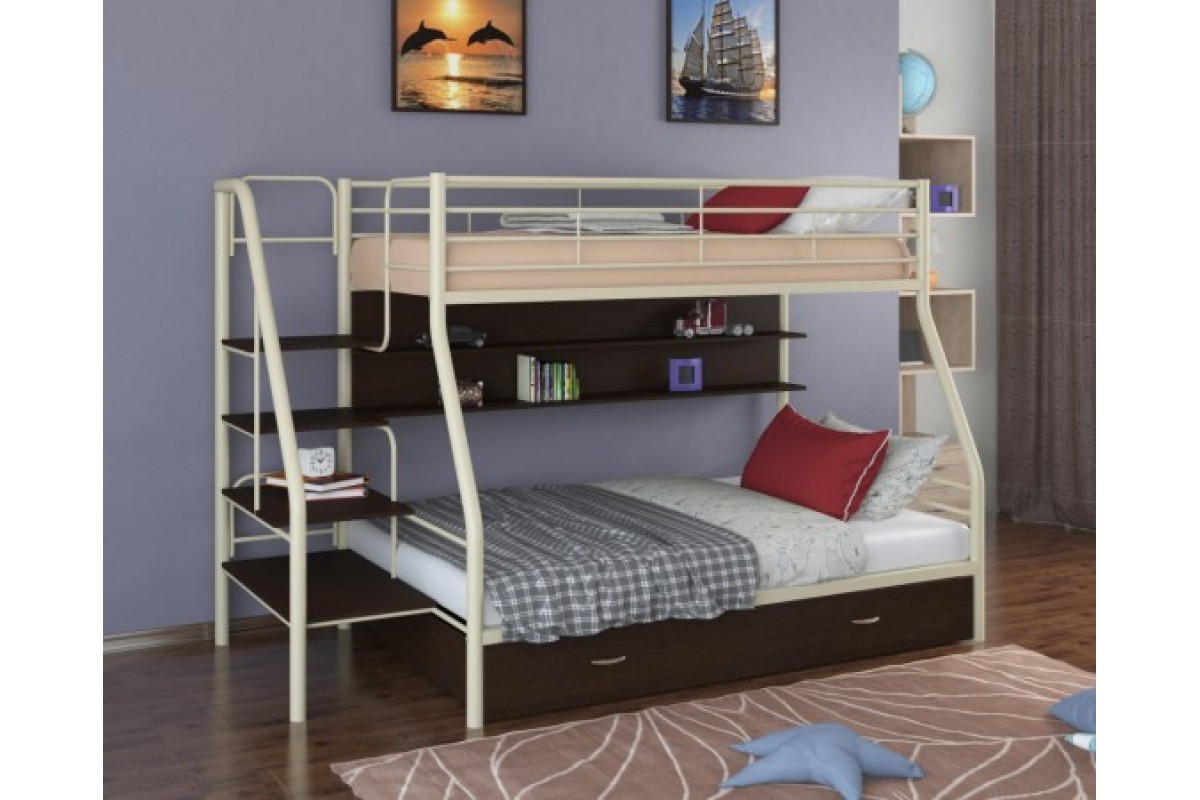 Металлическая двухъярусная кровать Толедо-1 ПЯ с полками и ящиком от производителя "Формула мебели" способна выдерживать нагрузку до 180 кг (на одно спальное место), что делает ее подходящей как для детей, так и для взрослых. Конструкция кровати предусматривает спальные места разных размеров 90/190 и 120/190см. В отличие от кроватей из ЛДСП выглядит менее громоздкой. В комплект входит прочная лестница, которую по Вашему желанию можно установить справа или слева.