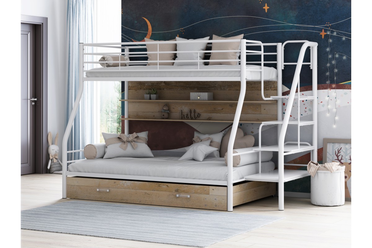 Полки отлично подойдут для размещения книг и сувениров, а выдвижной ящик, находящийся под нижним спальным местом, можно использовать для хранения постельных принадлежностей.