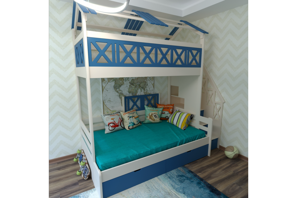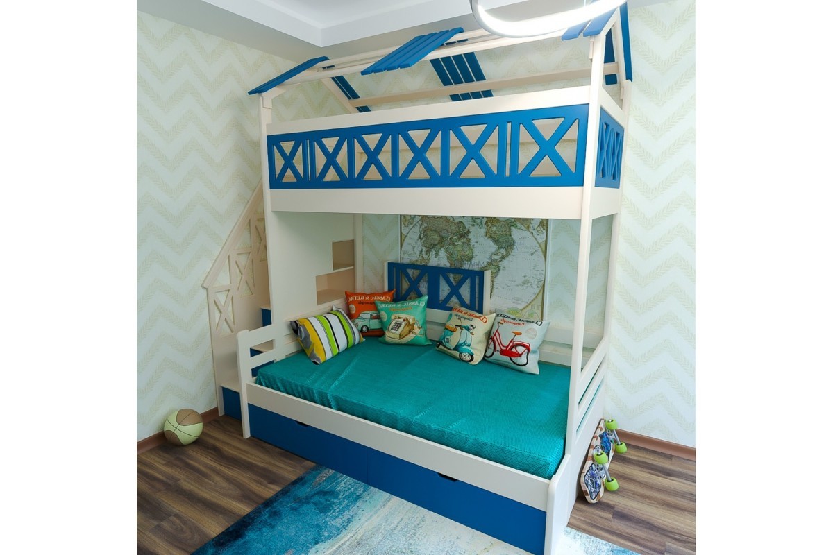 Двухъярусная кровать может комплектоваться лестницей комодом, а также выдвижными ящиками для удобного хранения вещей, игрушек и постельных принадлежностей.