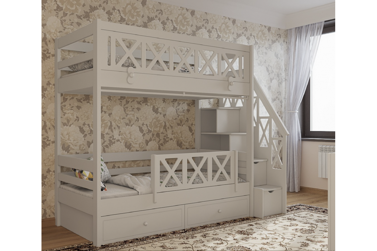 Приобретая двухъярусную кровать, родители решают сразу несколько задач: как экономично использовать пространство детской комнаты, а также подарить максимальный комфорт своим чадам. Специальные защитные бортики и прочная лестница комод с удобными ступенями обеспечат безопасность Вашего ребенка во время сна и игр.