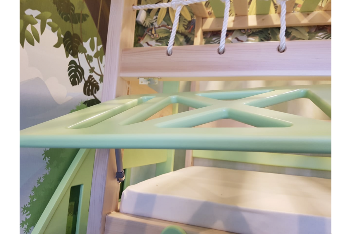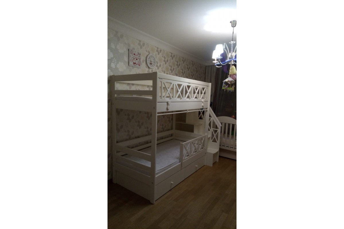 Использование экологически чистых материалов принесет уверенность в безвредности использования изделия ребенком, ведь каждые родители делают выбор только безопасных товаров для детей. Продукт изготовлен с заботой о детях, натуральные материалы и краска на водной основе создадут здоровую атмосферу в комнате ребенка. Нестандартное дизайнерское решение с открываемой панелью на втором ярусе для удобства смены белья и декор в стиле прованс непременно заинтересуют малыша, на такой кровати ребенок будет не только спать, но и проводить все свободное время – устраивать игры, общаться с друзьями.