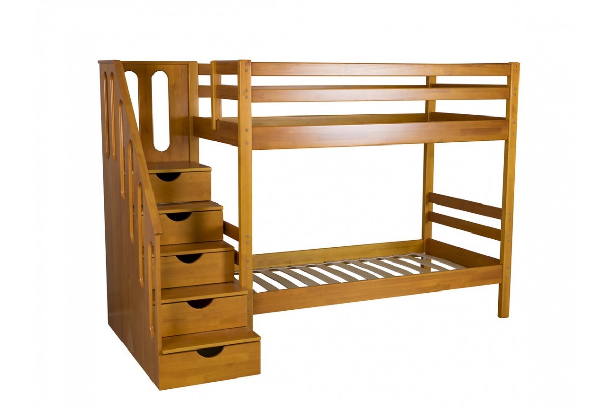 Кровать Журавушка - классическая двухъярусная кровать для двоих детей с лестницей-комодом - вмещает в себя 5 ящиков для хранения детских принадлежностей. При заказе указывается расположение лестницы "слева" или "справа". Также дополнительно можно заказать 2 ящика под нижний ярус.