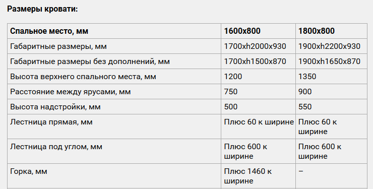 Размер спального места в двух вариантах на выбор: 160х80 см или 180х80 см. Габаритная высота зависит от размера спального места - 200 см или 220 см. Основание спального места ортопедическое, реечное. Матрасы приобретаются отдельно.