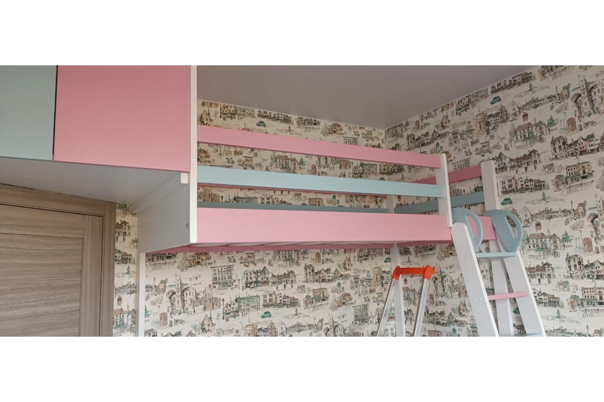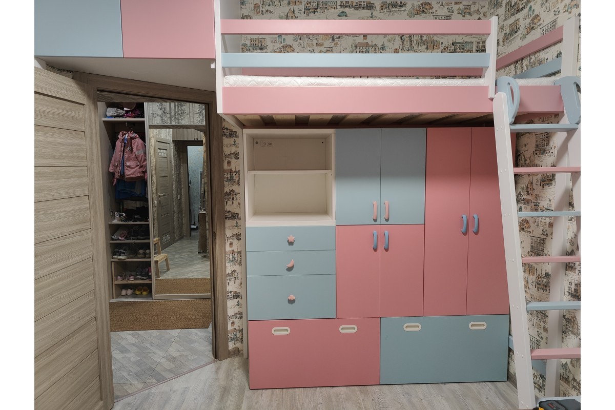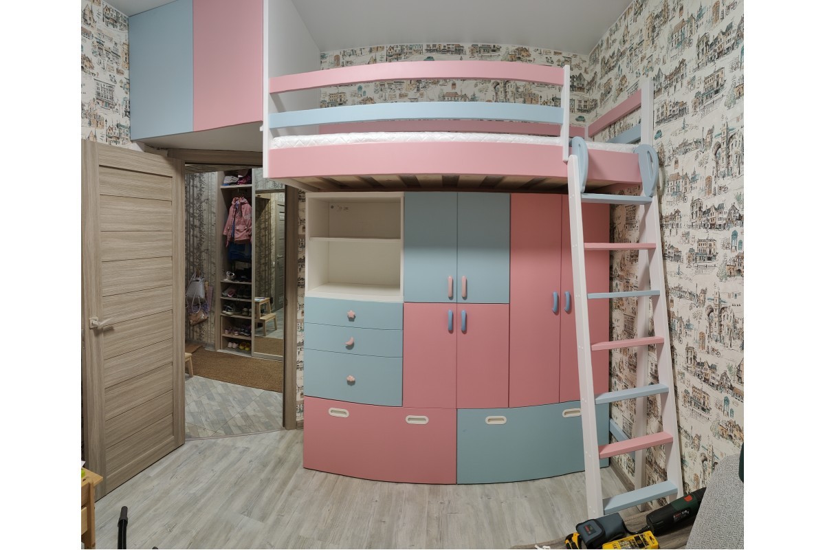 Мы не раз говорили, что кровать-чердак - это максимально практичный элемент мебели для оформления интерьера детской комнаты. Этот случай подтверждает наши слова на 200%. За счет кровати- чердака в детской комнате было оборудовано полноценное, комфортное спальное место, без ущерба свободному пространству!