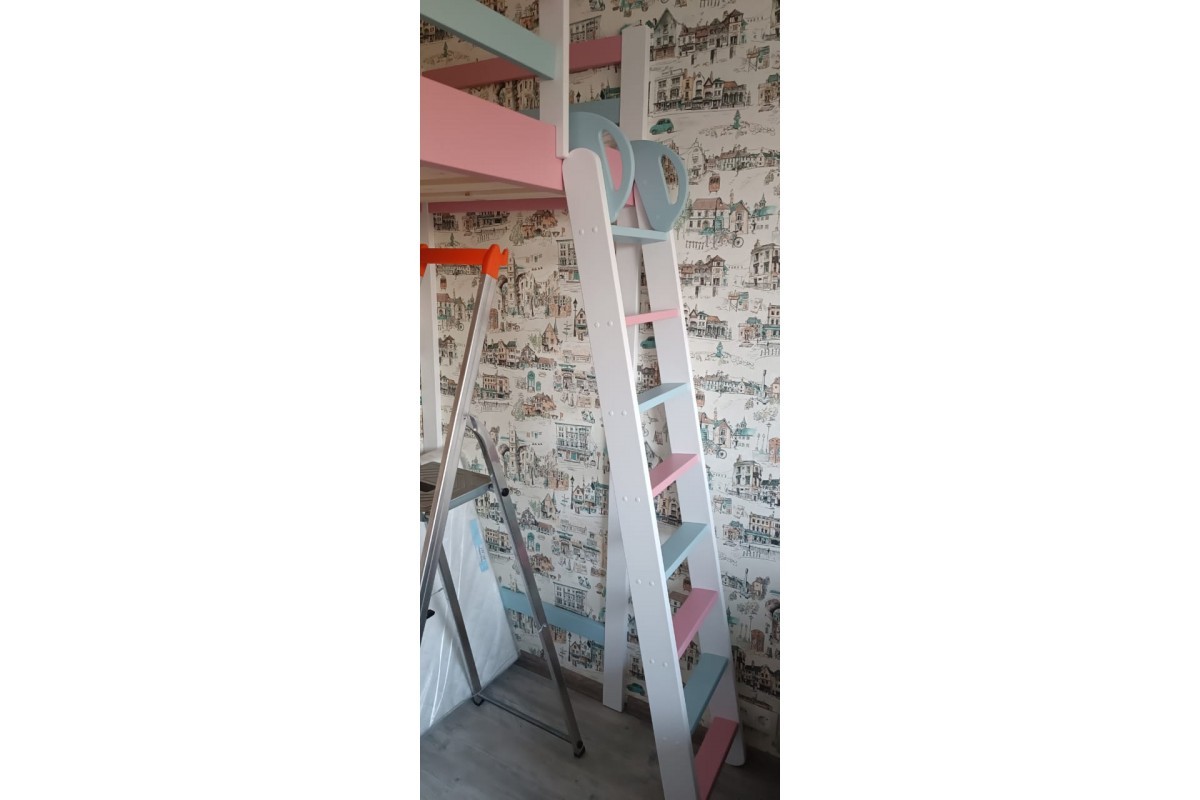 Кровать выполнена в классическом варианте, высокие бортики для комфортного сна и спокойствия родителей. Наклонная лестница с удобными ручками и антресоль, которая не только подойдет для хранения сезонных вещей, но и создаёт законченный образ для кровати.