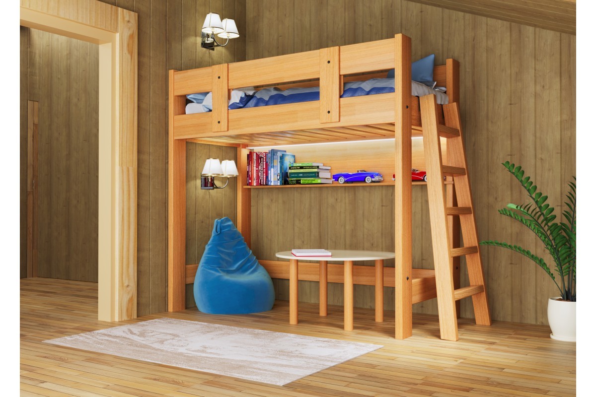 Кровать чердак Ранчо, идеально передает эту атмосферу. Кровать выполнена из массива сосны, возможно изготовление из массива бука или дуба. Четкие линии, отсутствие декора, нарочитая небрежность, явно видная текстура дерева, массивность. Все это дает четкие отсылки на выбранный стиль.