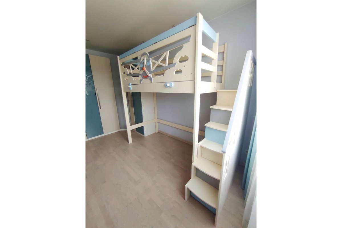 Лёгкий и воздушный дизайн, нежные пастельные оттенки, максимум воздуха в деталях. Удобная лестница-комод с широкими плоскими ступенями, похожая на трап, и высокий бортик обезопасят малыша от падений.