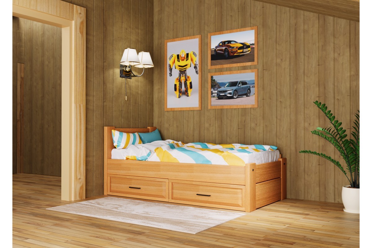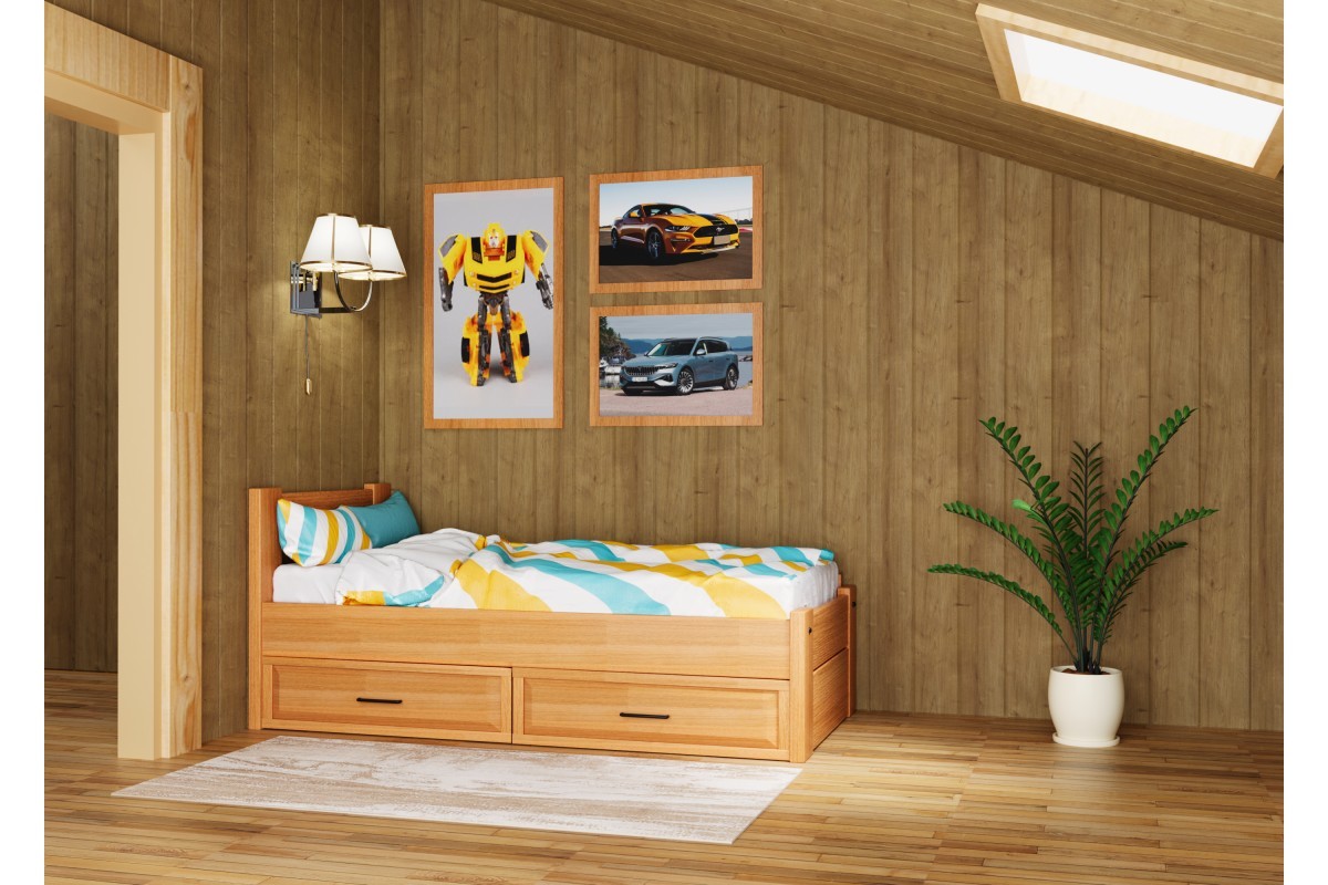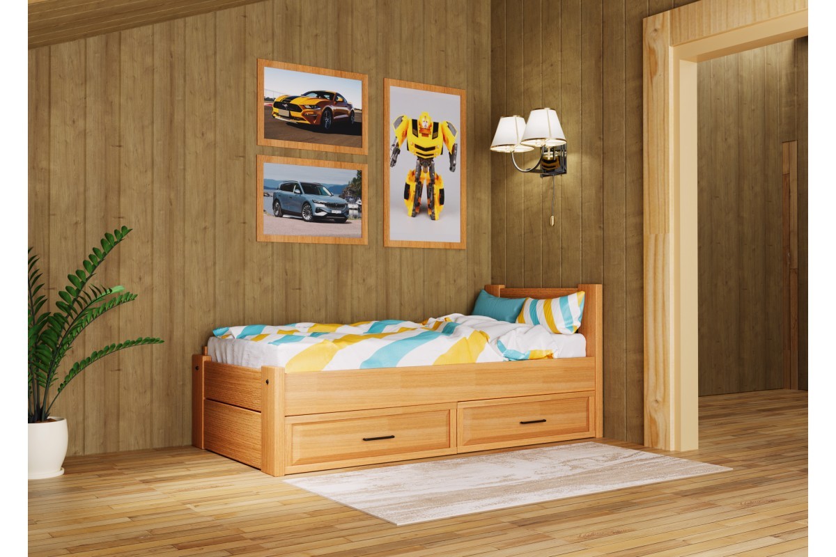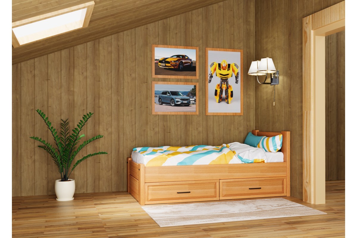 Кровать выполнена из массива сосны и покрыта бесцветным лаком, возможно изготовление из массива бука или дуба, и тонировка или покрытие маслом. Под кроватью расположены два вместительных выкатных ящика, которые прекрасно подойдут для хранения сезонной одежды.