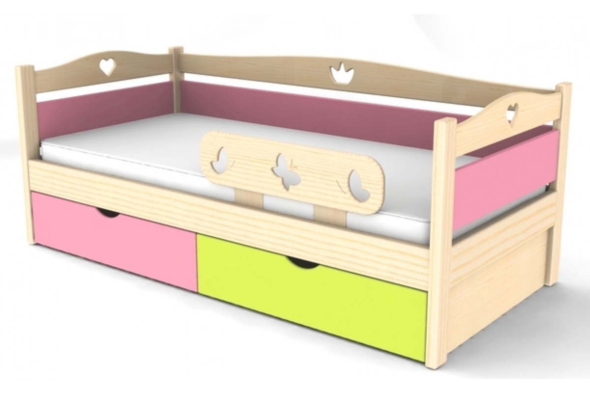 Кровать выполнена с тремя спинками и одним небольшим съемным бортиком, на котором сделаны тематические вырубки. Их можно выбрать на свой вкус: сердечки, бабочки, цветочки.