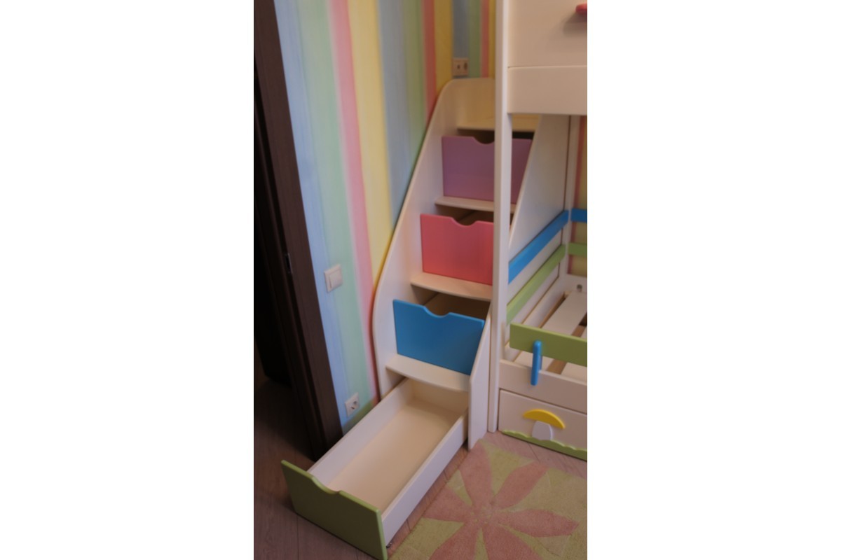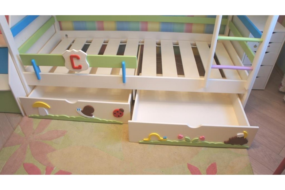 Детская двухъярусная кровать может комплектоваться выдвижными ящиками и лестницей комодом для удобного хранения вещей, игрушек и постельных принадлежностей.