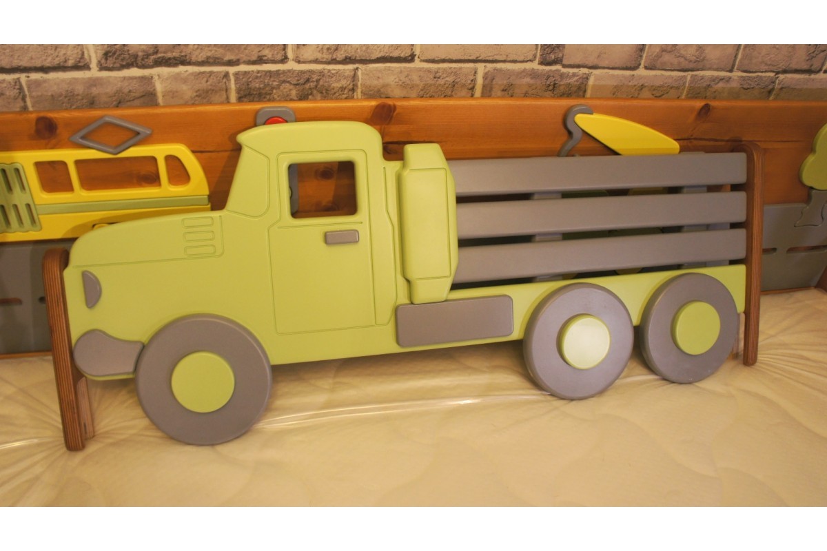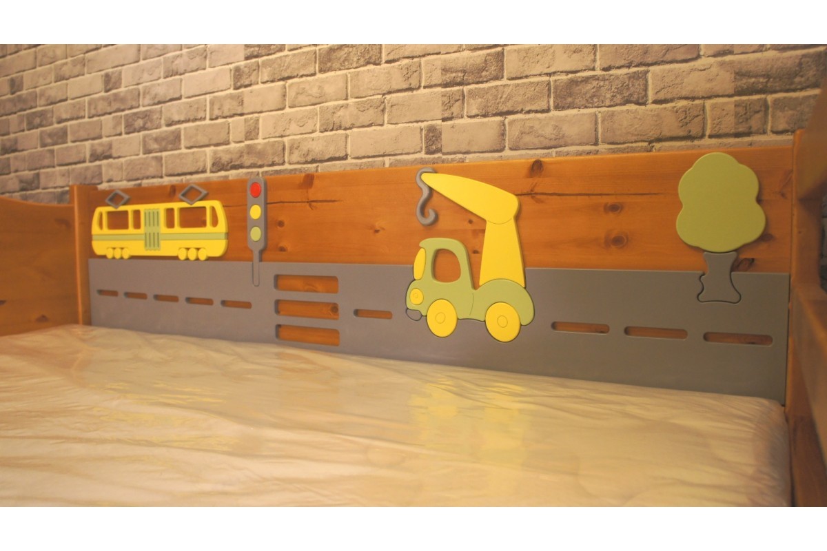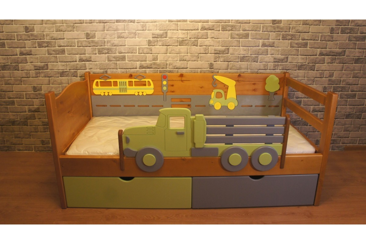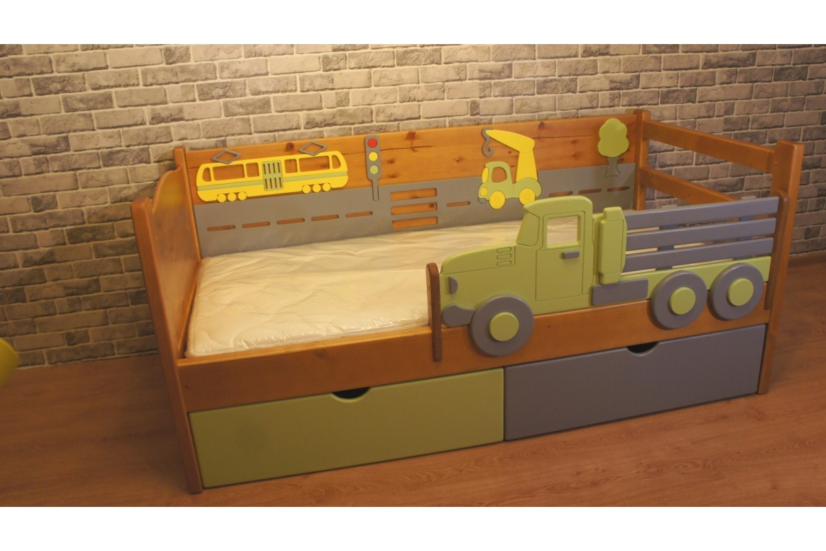 Декоративный внутренний бортик, с целой историей про машинки поможет развить мелкую моторику и воображение ребенка. А внешний - в форме грузовика станет интересной деталью интерьера. Кровать дополнена двумя выкатными ящиками для хранения - очень практичное решение. Все элементы дизайна возможно заменить под Ваш интерьер.