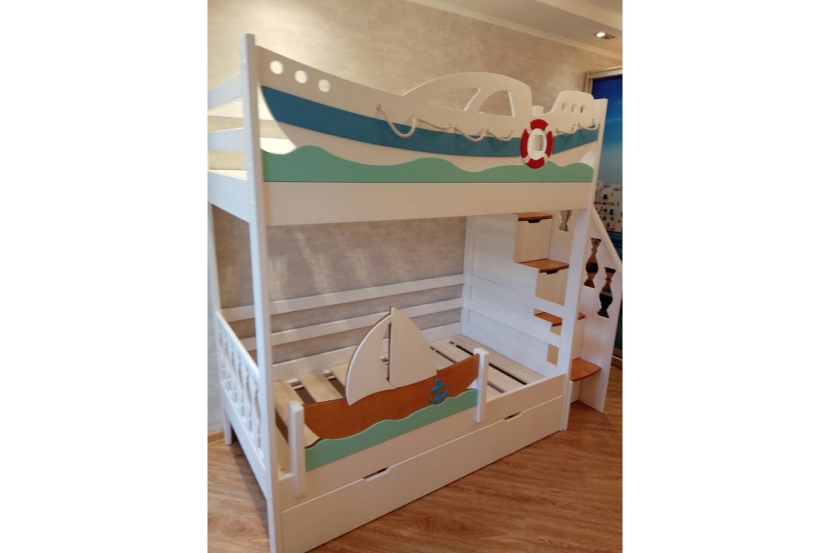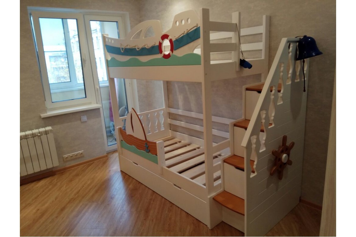 Кровать может комплектоваться ящиками для удобного хранения вещей, игрушек и постельных принадлежностей. Родители могут не переживать, что малыш упадет во сне, так как кровать оснащена защитными бортами на каждом из ярусов. Ну а главная деталь, которая в первую очередь понравится вашим малышам - крутящийся штурвал, который даст почувствовать себя капитаном настоящего морского судна!