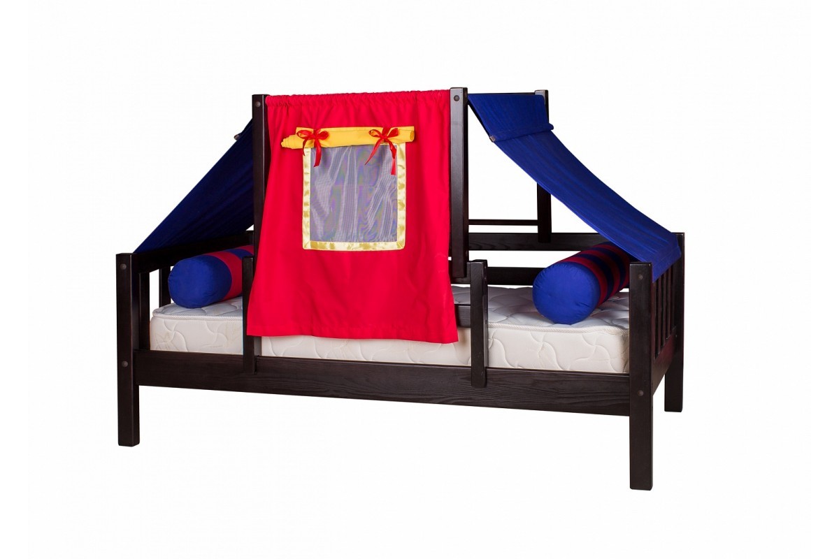 Шторки выполнены в красно-синих тонах, ткань - поплин. Они не входят в базовую стоимость кровати. Выберите нужную комплектацию при оформлении заказа.
