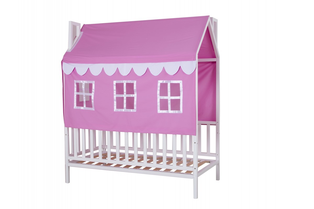 Кровать из натурального дерева детская Домовёнок-3 с текстилем в розовых тонах, с дизайном в виде игрового домика с трубой, крышей и окошками.