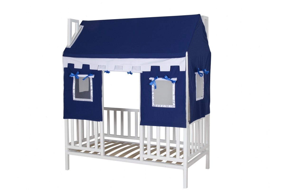 Текстильный декор (тканевая крыша и окошки) выполнены в синем тоне, что прекрасно подойдёт для мальчика.