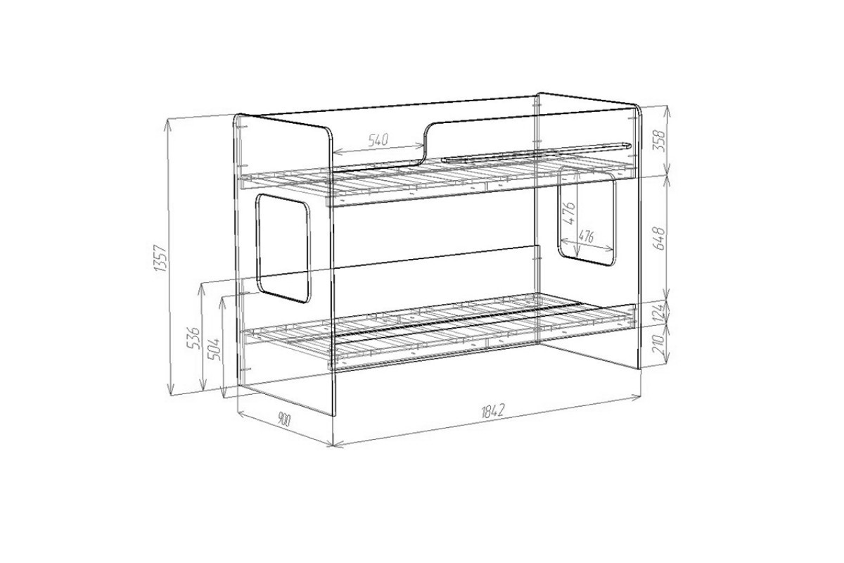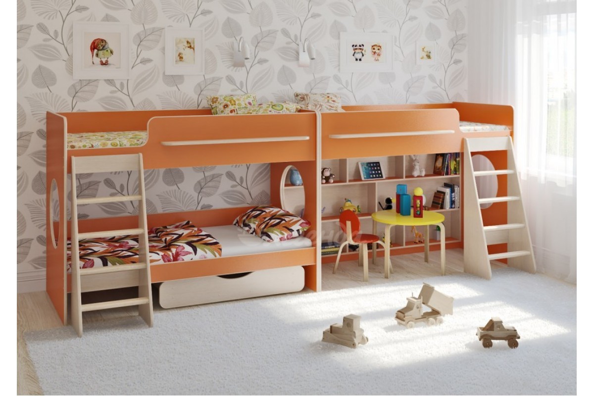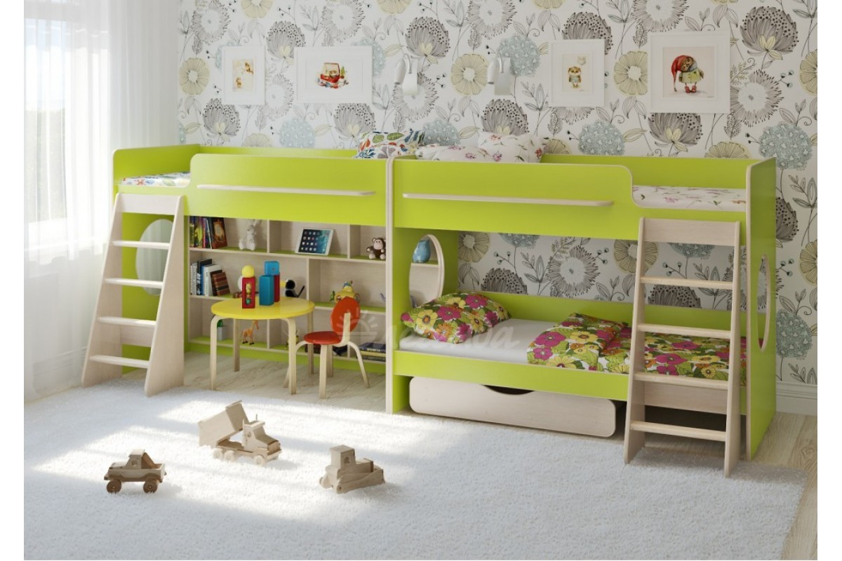 Высота обеих кроватей – всего 1350мм. Удобно - взрослый может заправить кровать,не забираясь на второй ярус!Второй ярус на уровне роста взрослого человека – гарантия свежего воздуха для ребенка.