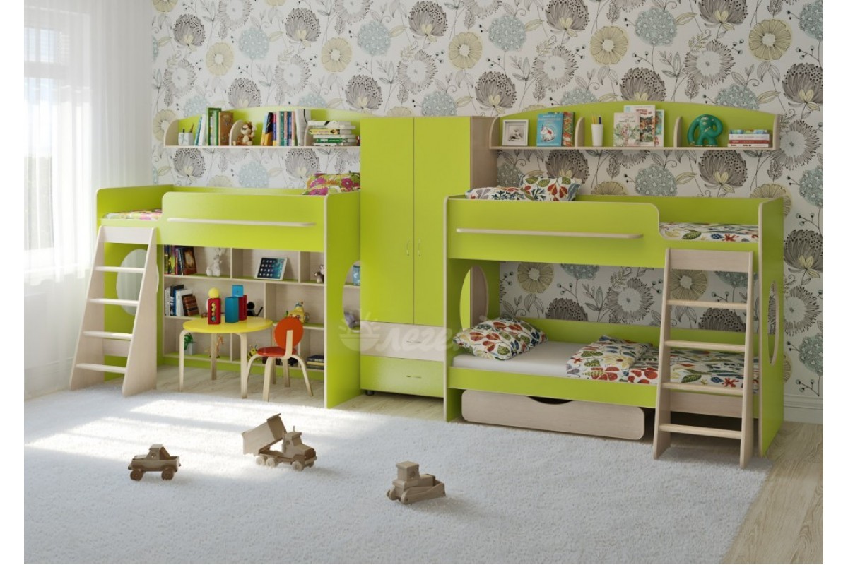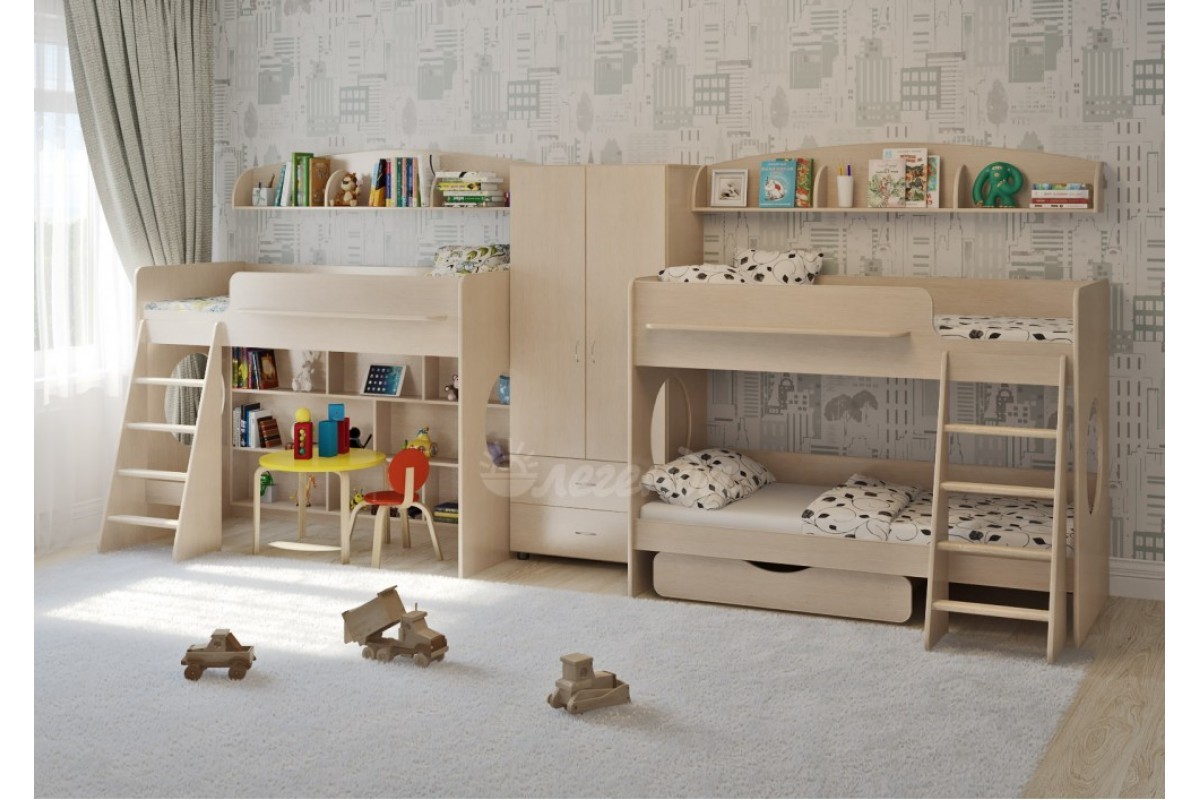 Высота обеих кроватей – всего 1350мм. Удобно - взрослый может заправить кровать,не забираясь на второй ярус!Второй ярус на уровне роста взрослого человека – гарантия свежего воздуха для ребенка.