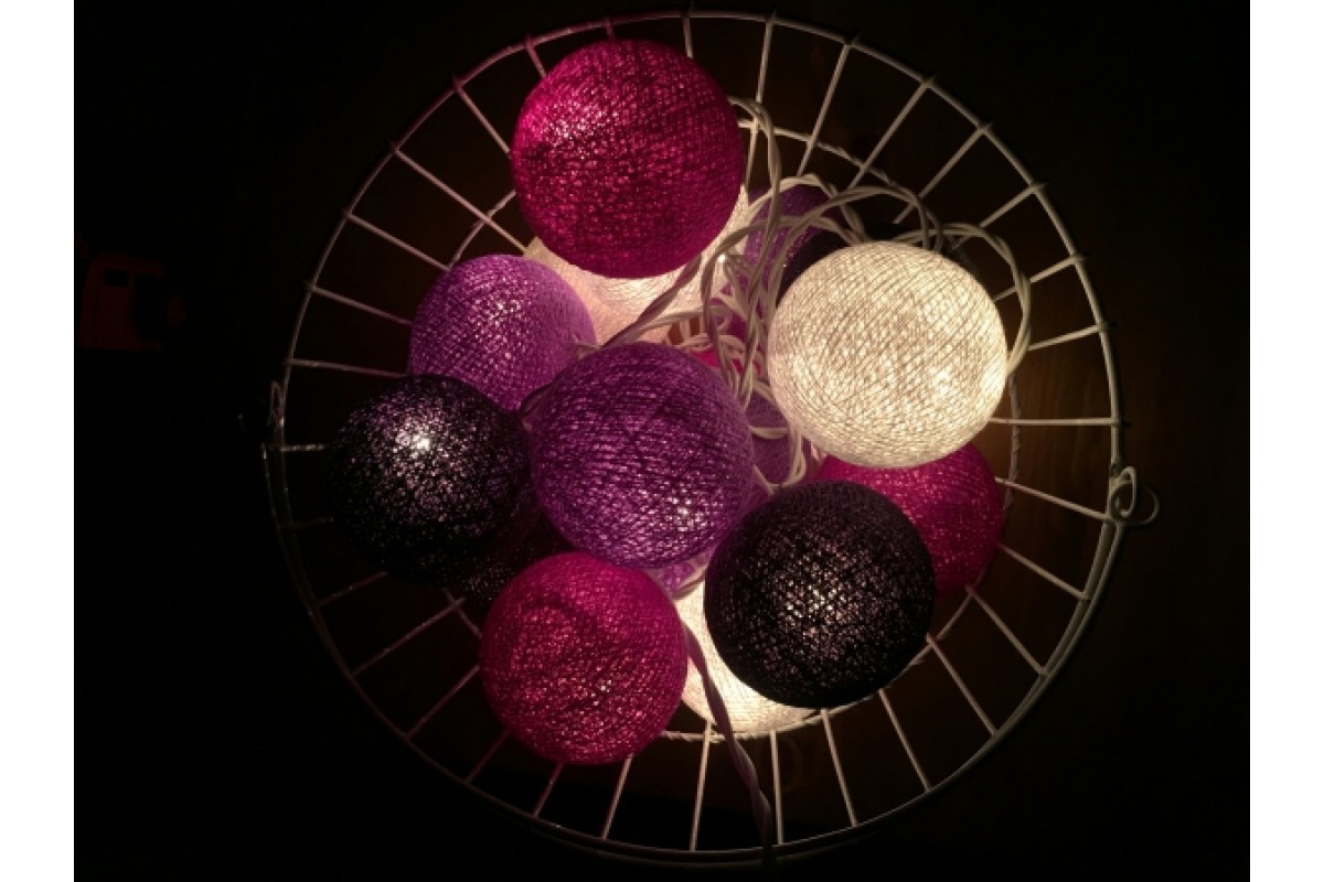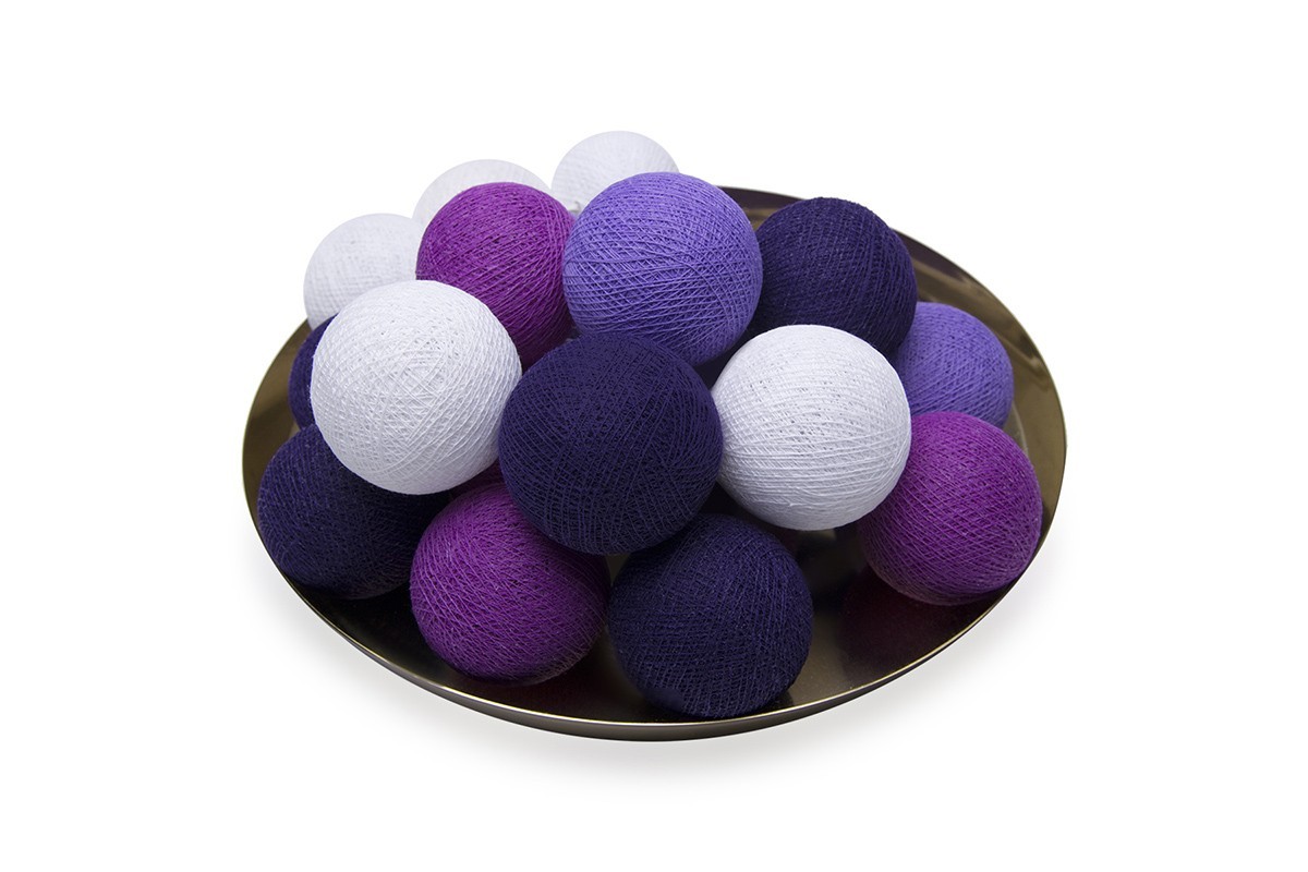 С фиолетовым цветом в интерьере связано, пожалуй, больше всего неоправданных мифов. Многие любят его, но не решаются вводить в интерьер. Холодный оттенок заставляет многих поменять свой выбор в пользу иного цвета. Электрическая гирлянда из хлопковых шаров фиолетового цвета дает возможность наконец-таки не бояться экспериментов. Тайская гирлянда в холодных оттенках дает такую возможность.