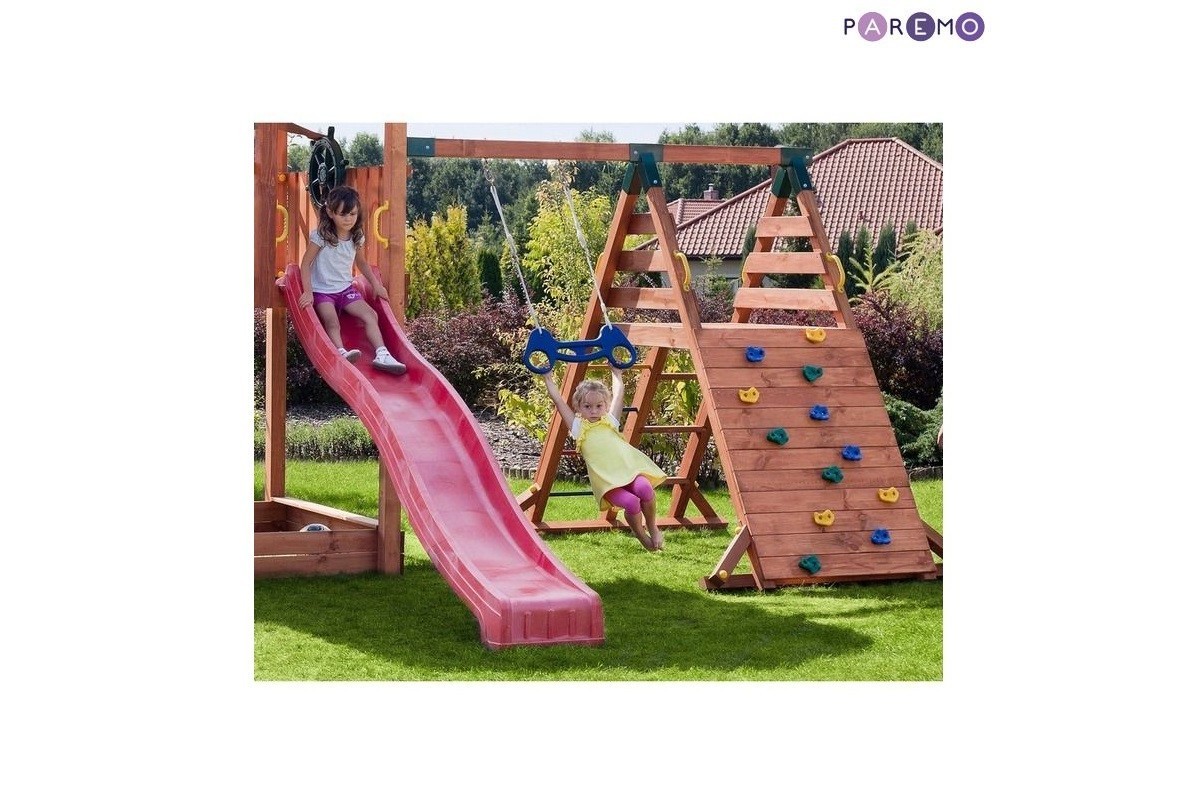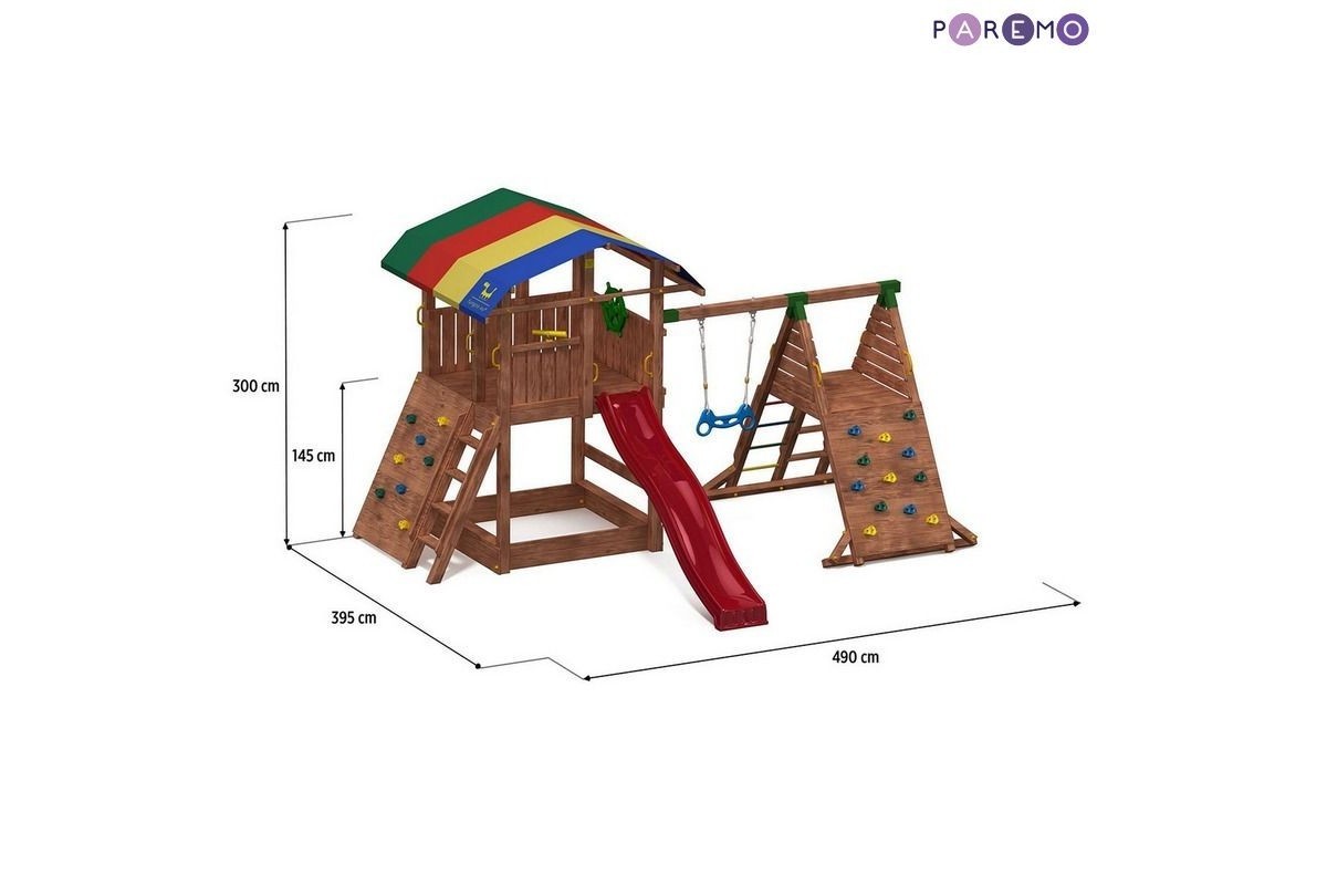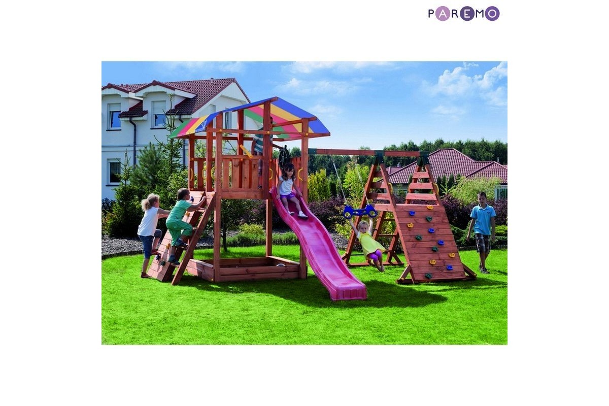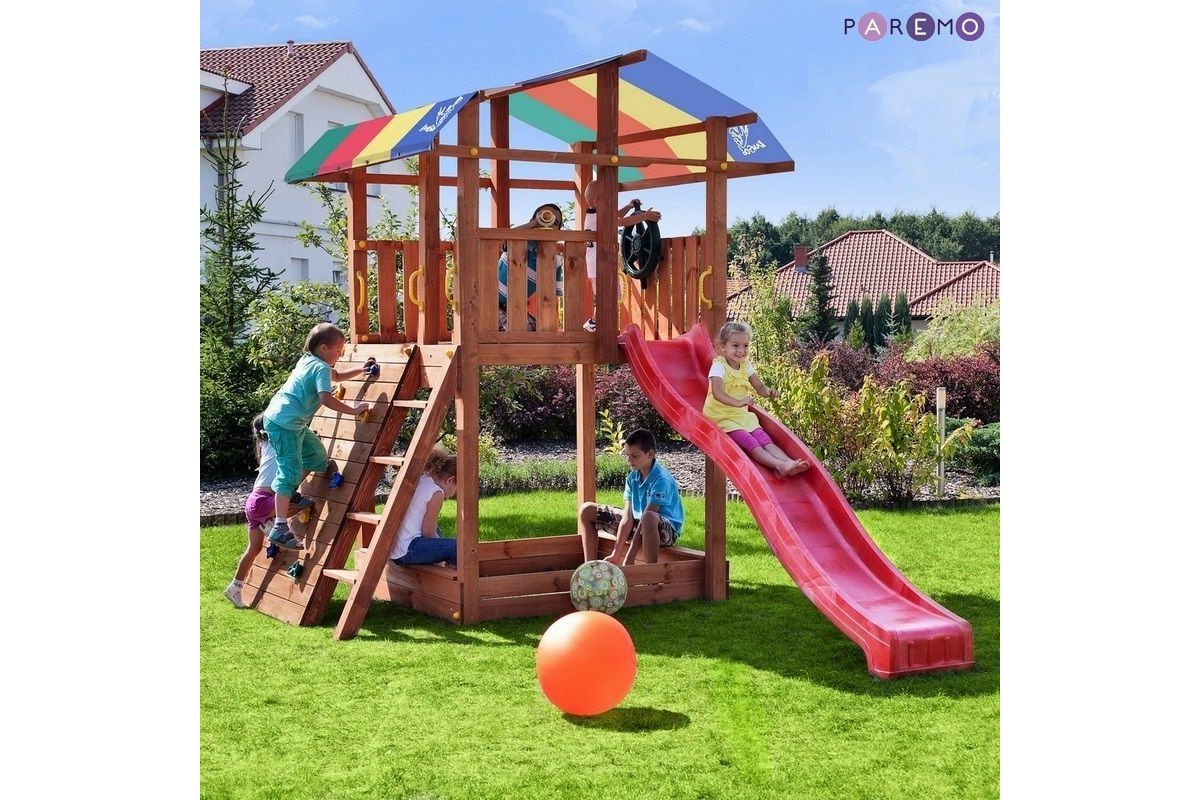Набор для игровой площадки: детский домик с песочницей, тентом, горкой, качелей и сдвоенными кольцам, PAREMO