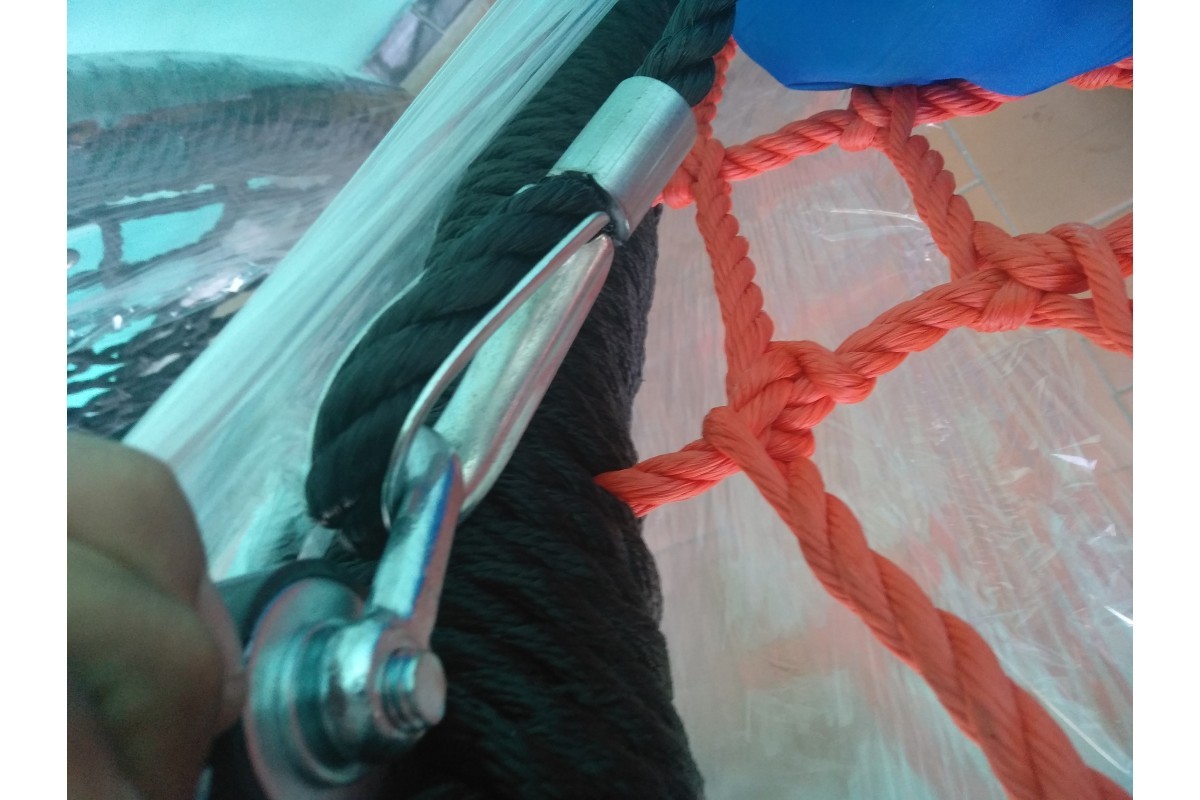 Каждый конец сети опресован специальной муфтой, в которой закрепленно шарнирное соединение для крепления к основанию (ободу).