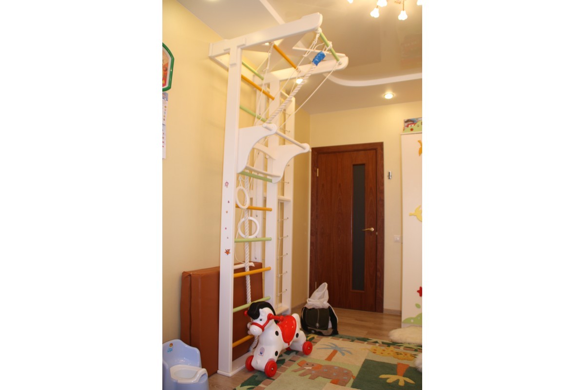 На стенку можно закрепить съемный турник, канат, кольца, качели, лестницу или оборудовать полноценную спортивно игровую зону.