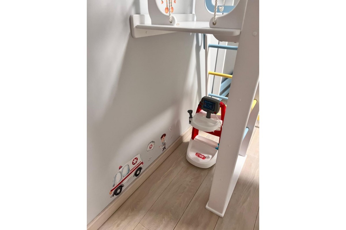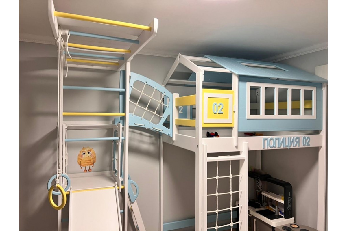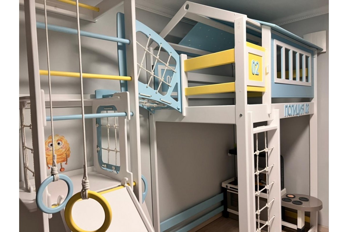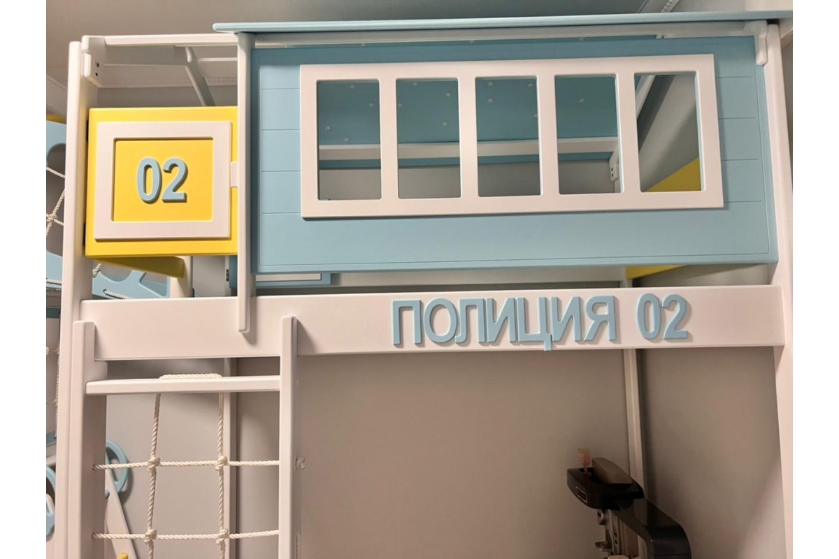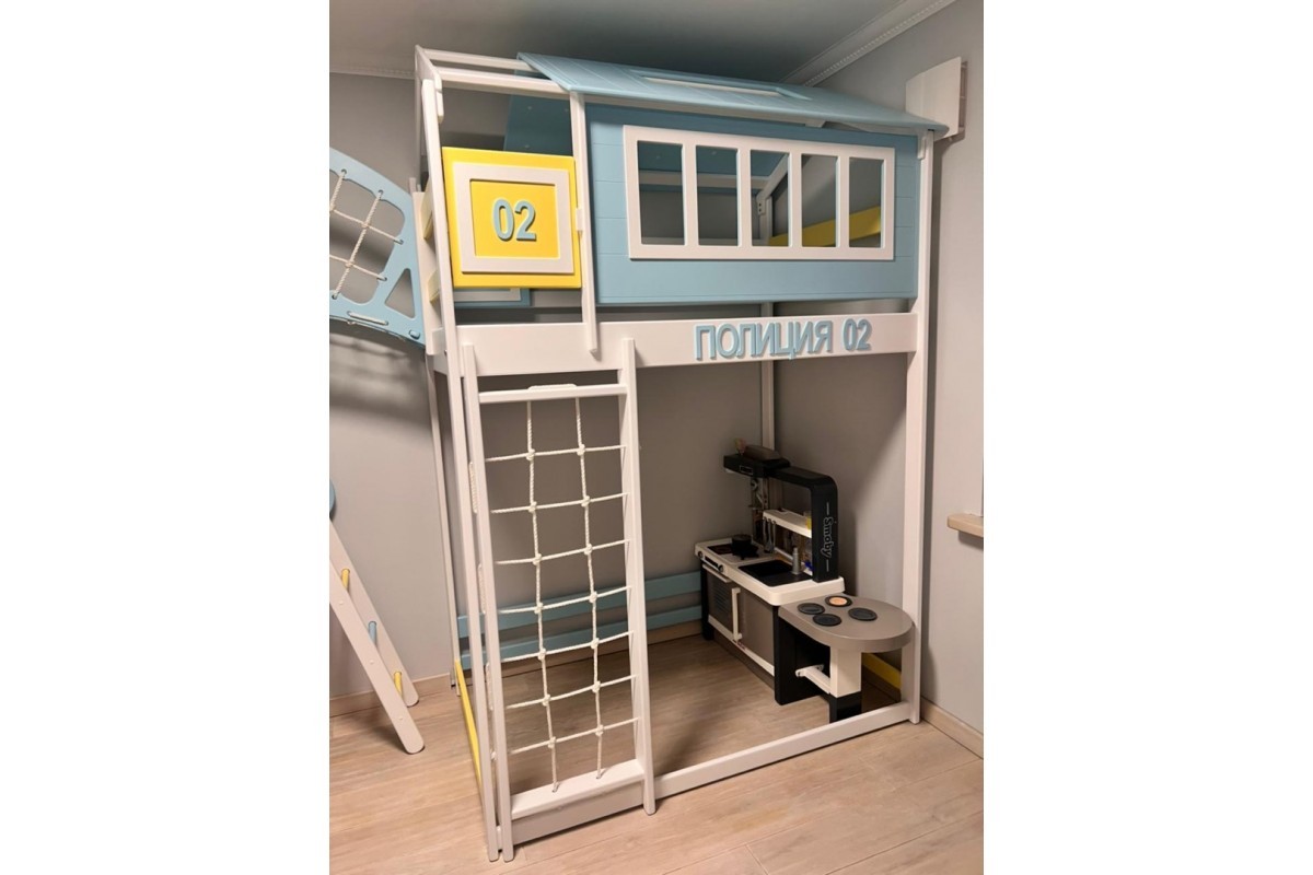 Кровать чердак сделана в виде полицейского участка. Боковая панель выполнена в виде окошек, из них можно оглядеть окрестности в поисках правонарушителей. С таким бдительным правоохранителем в доме уж точно будет порядок.