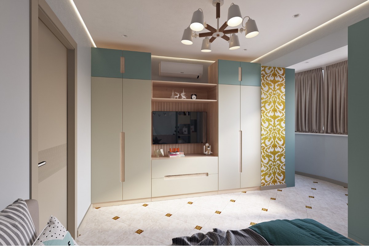 За хранение вещей отвечает большая стенка с двумя двустворчатыми шкафами и вместительными выкатными ящиками. Дополнительно в комнате установлено несколько стеллажей с открытыми полками и закрытыми. Они не только помогут в организации порядка, но и добавляют особый стиль детской комнате.