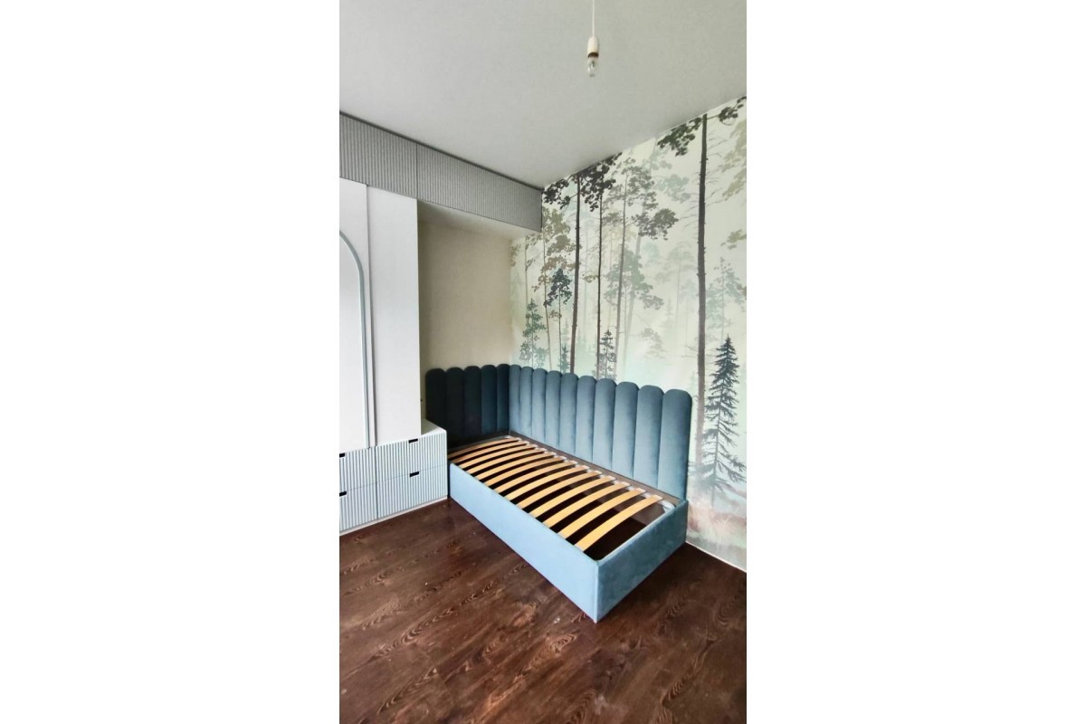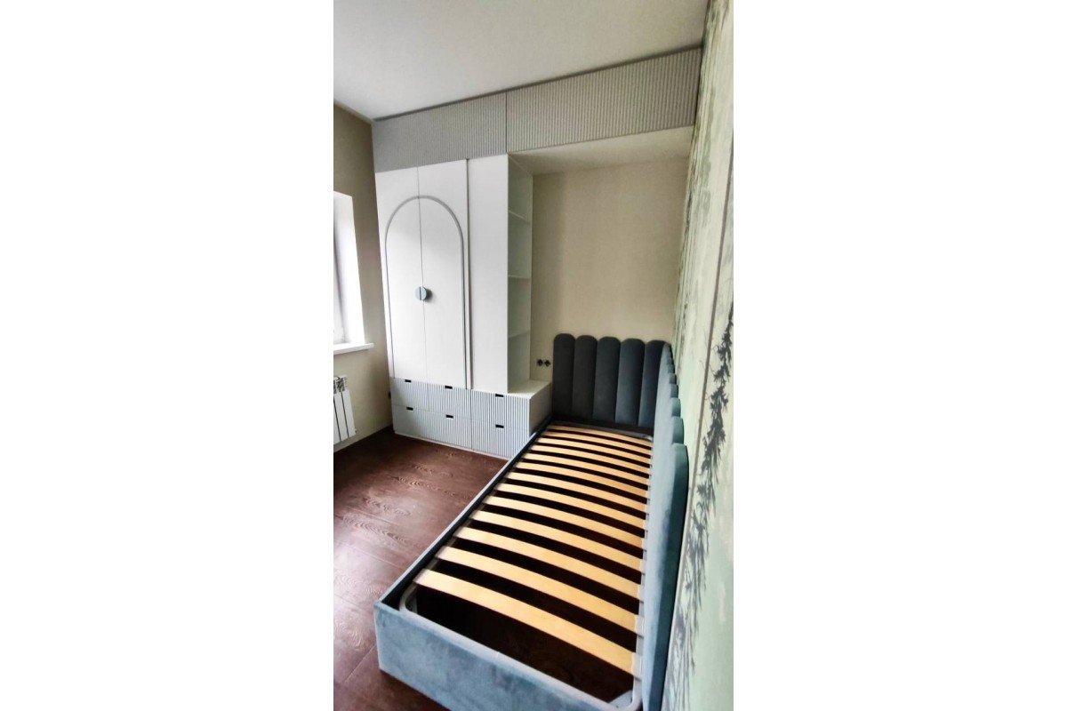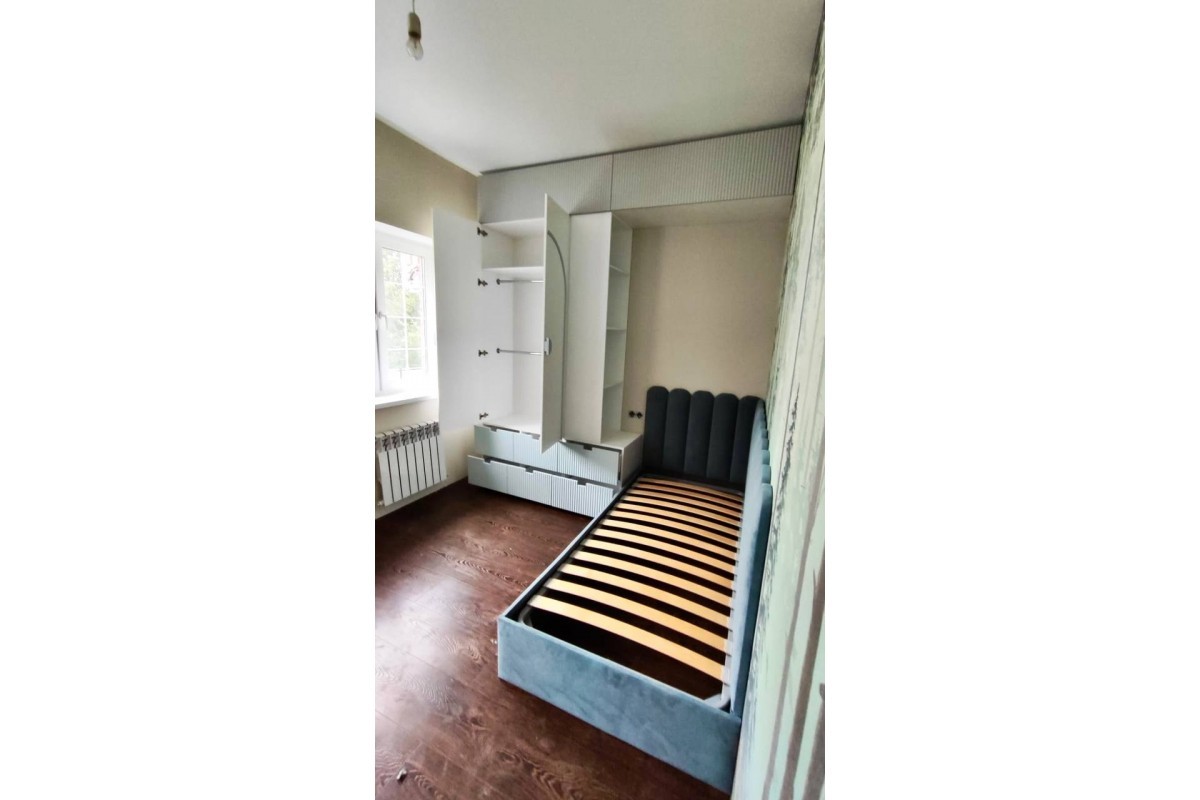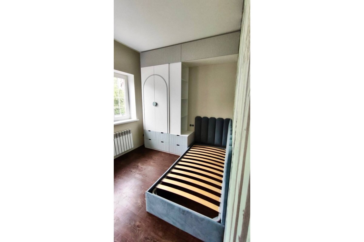 В образовавшуюся нишу прекрасно вписалась мягкая кровать, делая комнату максимально теплой и уютной. Вы всегда можете обсудить с нашими дизайнерами свои идеи и реализовать их, максимально комфортно вписывая в имеющийся интерьер.