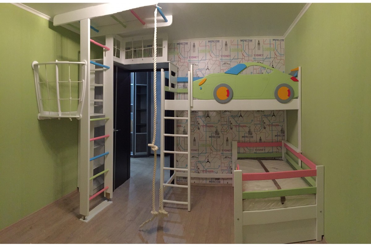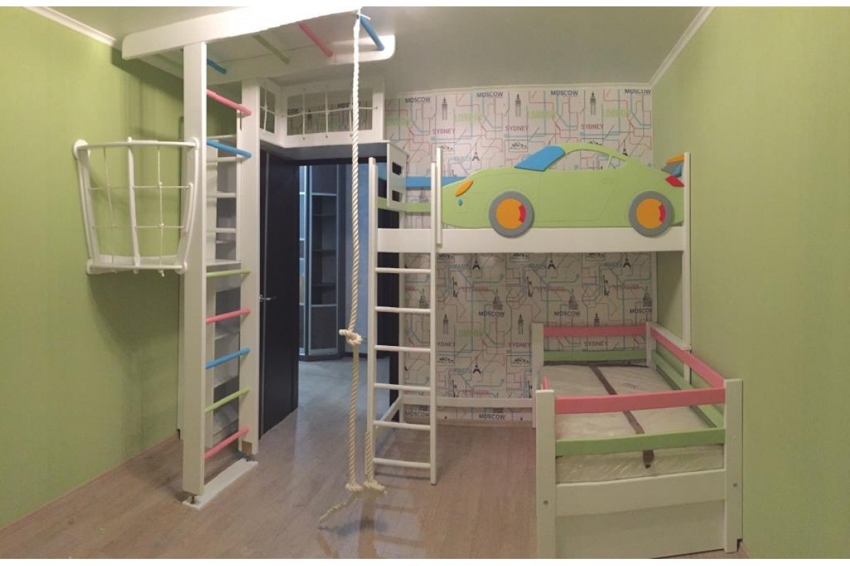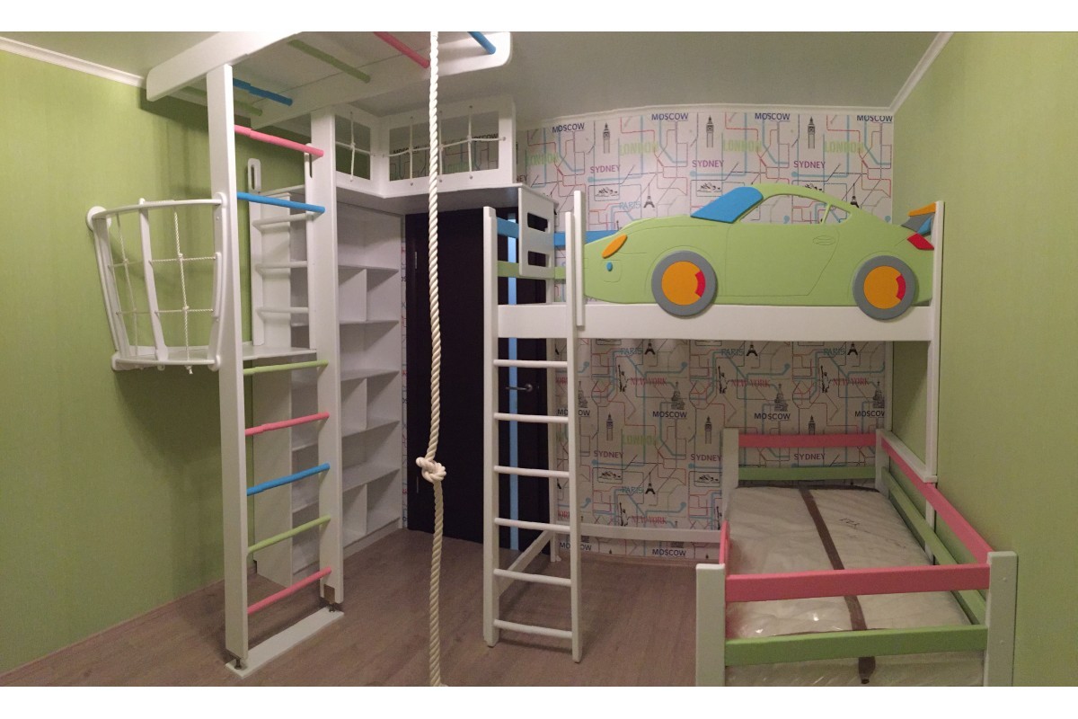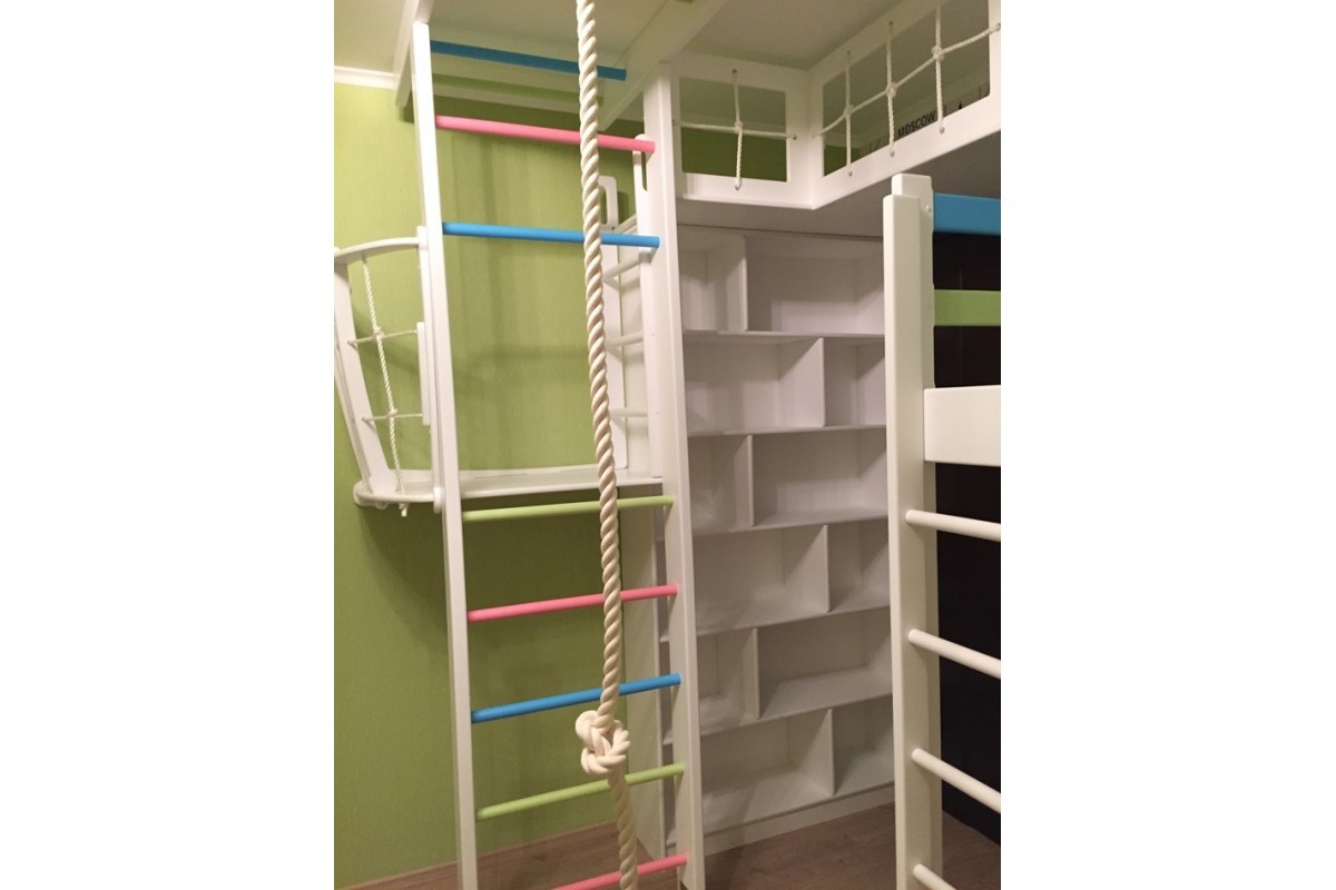 О здоровье и физической активности позаботится спортивный комплекс с классической шведской стенкой, смотровой площадкой и лабиринтом, которой приведет прямо на второй ярус кровати. Элементы можно менять, в зависимости от возраста и интересов ребенка.