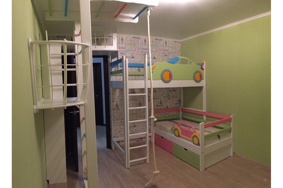 Кровати оформлены бортиками в виде милых машинок, нижняя дополнена выкатными ящиками, а кровать чердак классической лестницей. При необходимости нижнюю кровать можно переставить или убрать. Сон малышей будет сладким и безопасным.