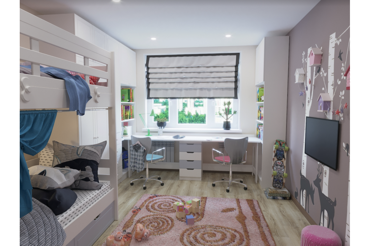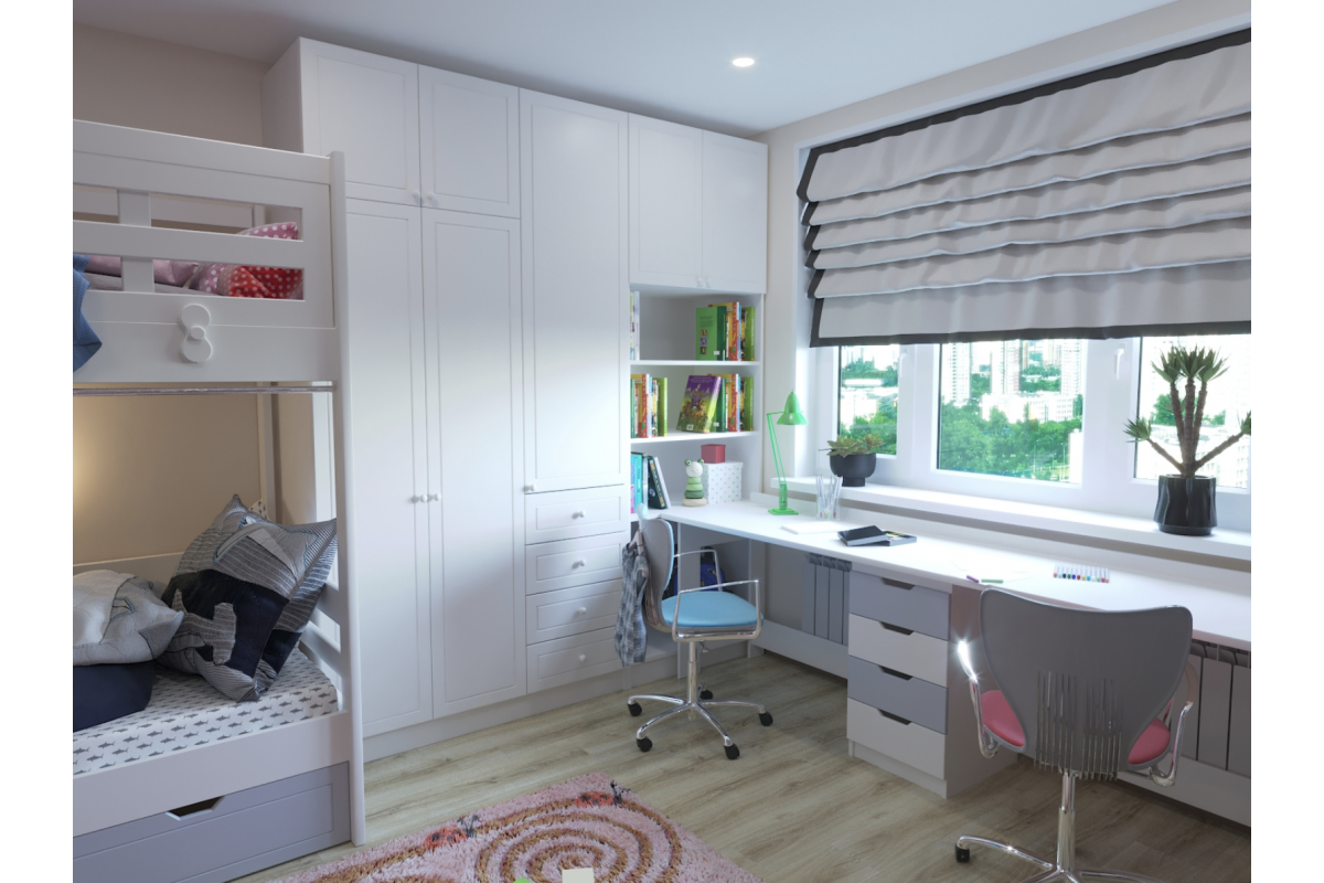 Как организовать рабочую зону в детской комнате для двух детей? Два письменных стола - это не выход. Поэтому мы создали двойной письменный стол, который даст возможность делать уроки детям одновременно и при этом не создаст нагромождение в комнате за счет своей органичной конструкции. Письменный стол разместили у окна, что очень благотворно будет влиять на зрение и эмоциональную разгрузку детей.