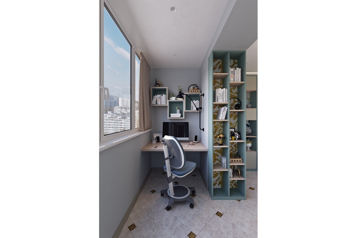 В нашем случае необычный, парящий письменный стол, который занял балконную нишу. Помимо того, что он невероятно стильный, мы сделали его еще и функциональным.